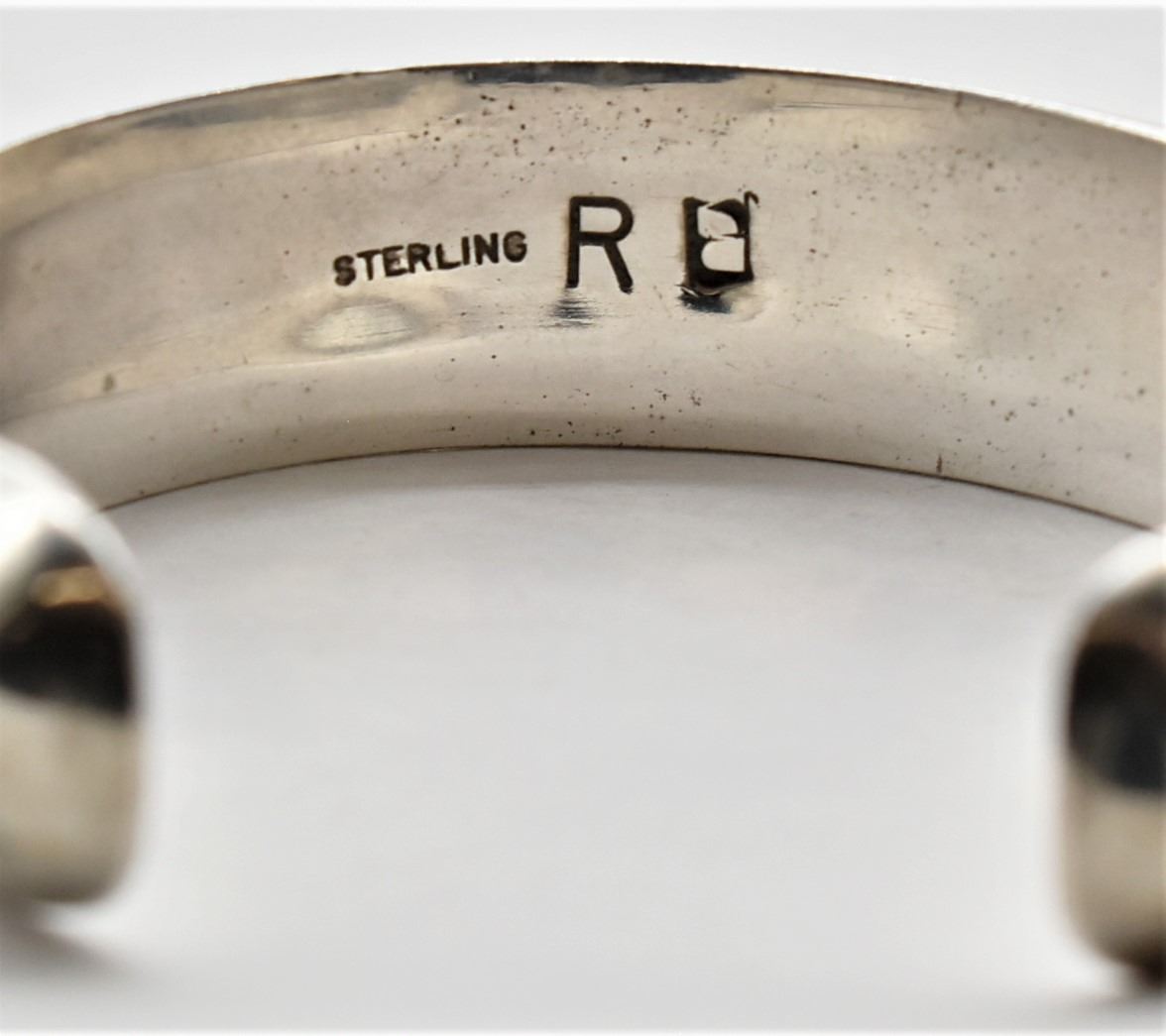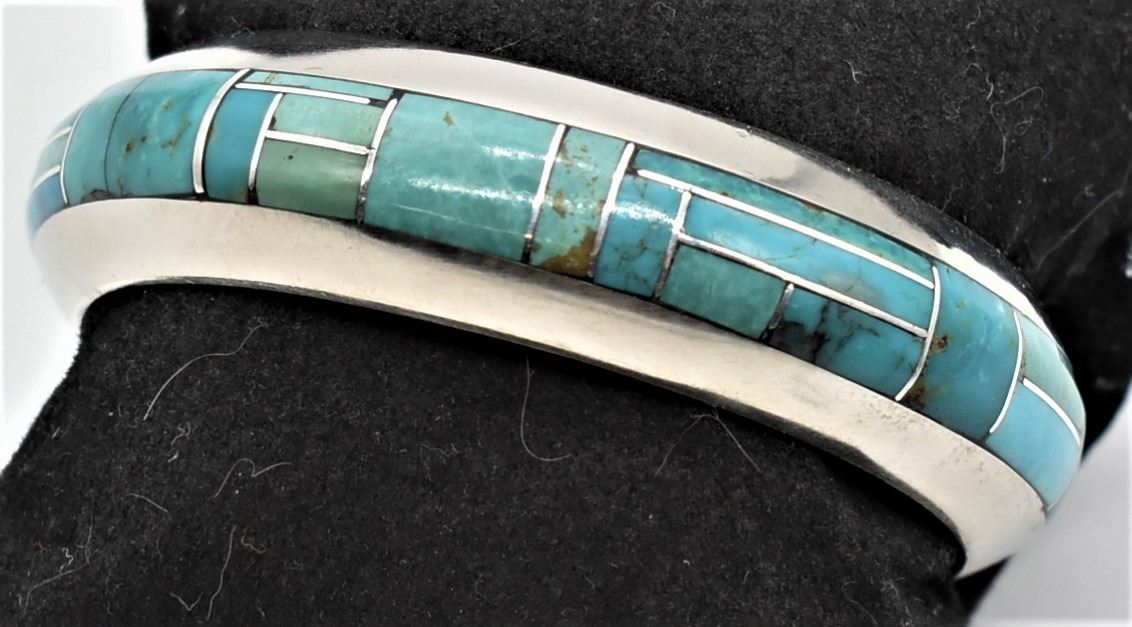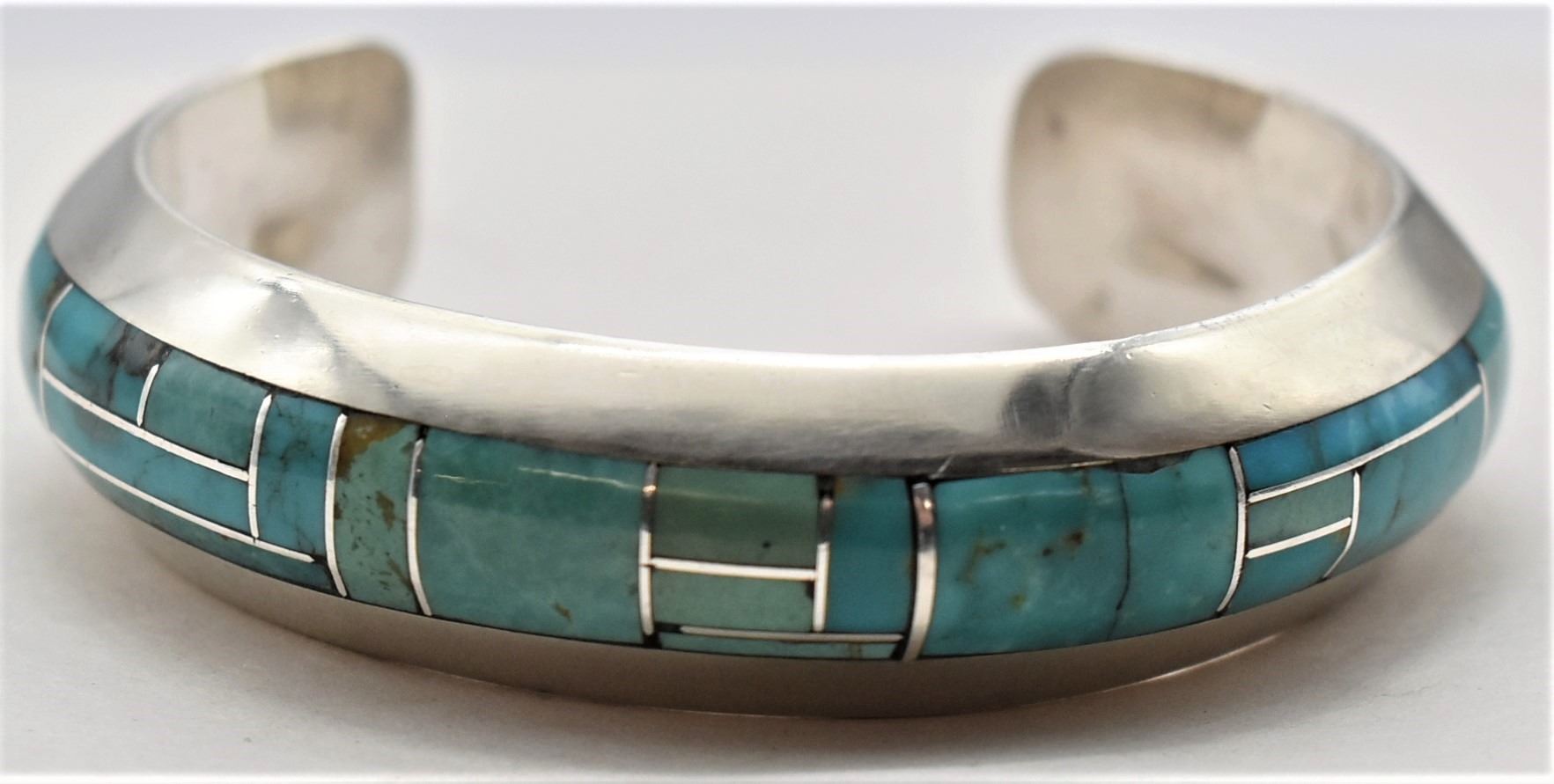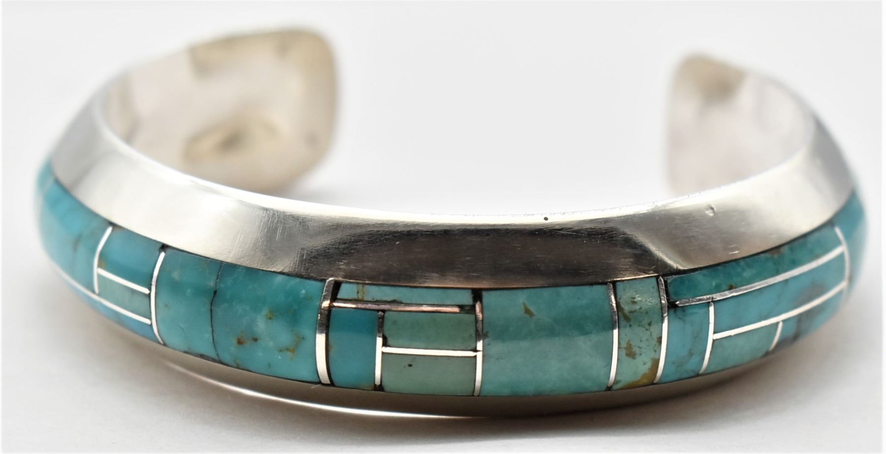 Native American Zuni Sterling Channel Inlay Turquoise Cuff Bracelet by Rick Booqua, inside measures 6'' x .5''W, hallmarked RB and stamped sterling, total gram wt. of 43, beautiful colors of turquoise