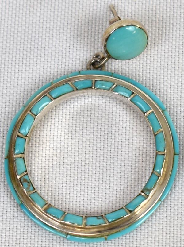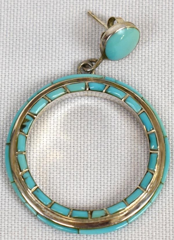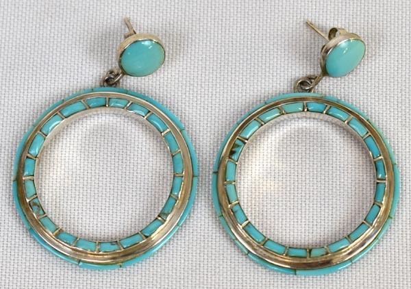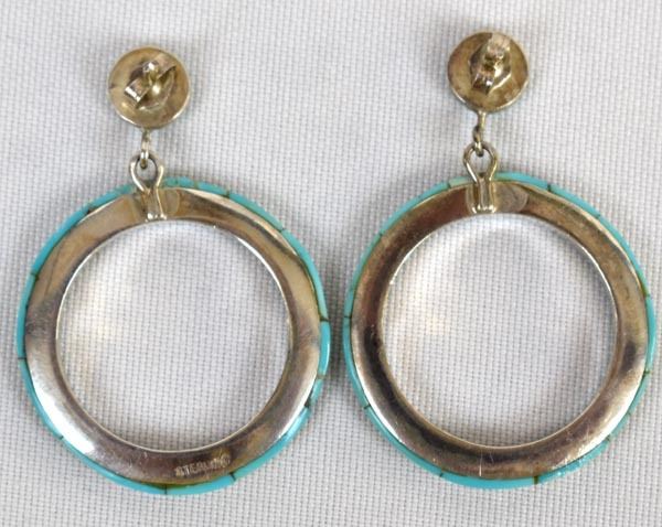 Native American Zuni Sterling Inlay Turquoise Hoop Earrings, measure 1.25'' x 2'', stamped sterling