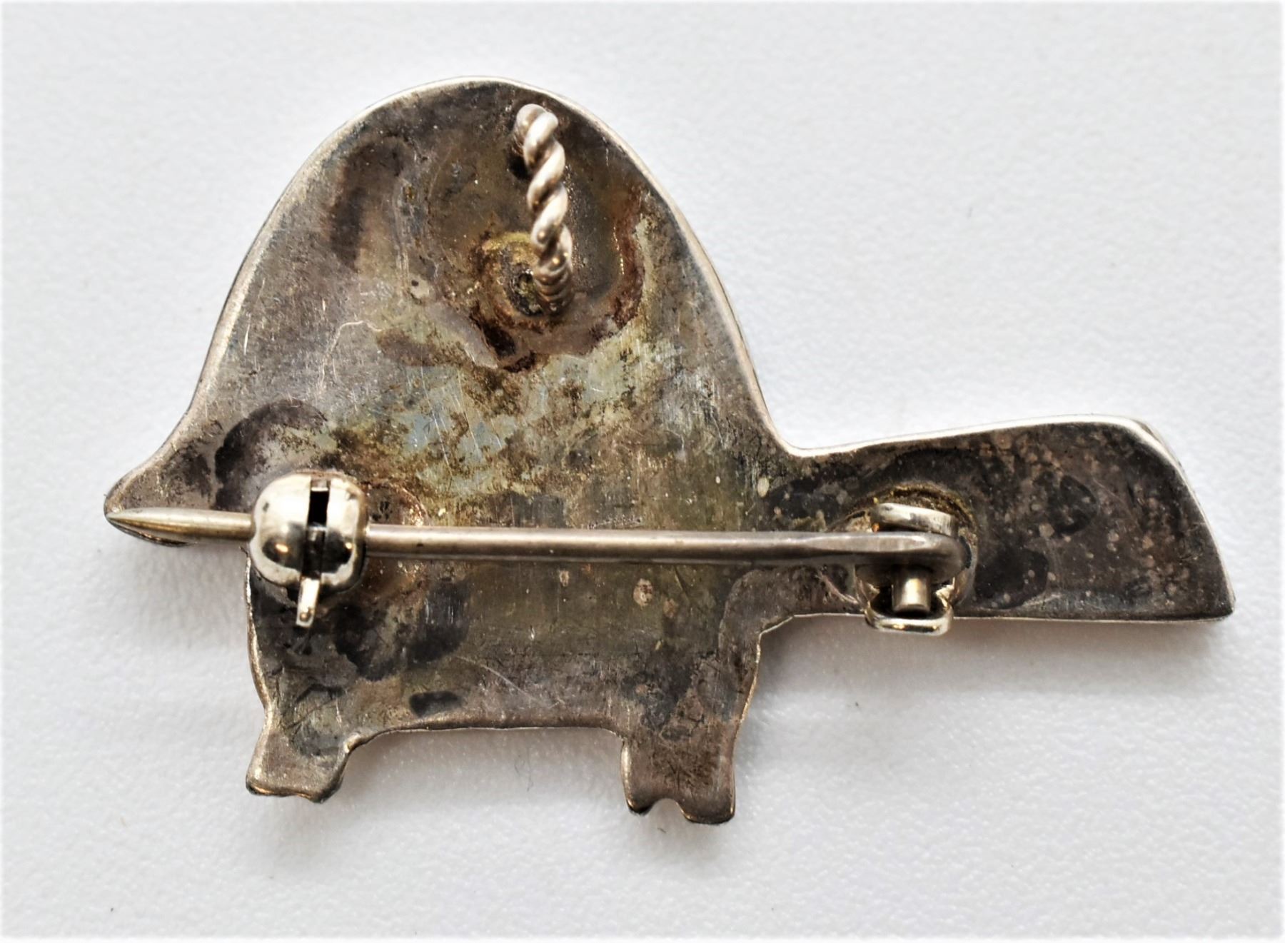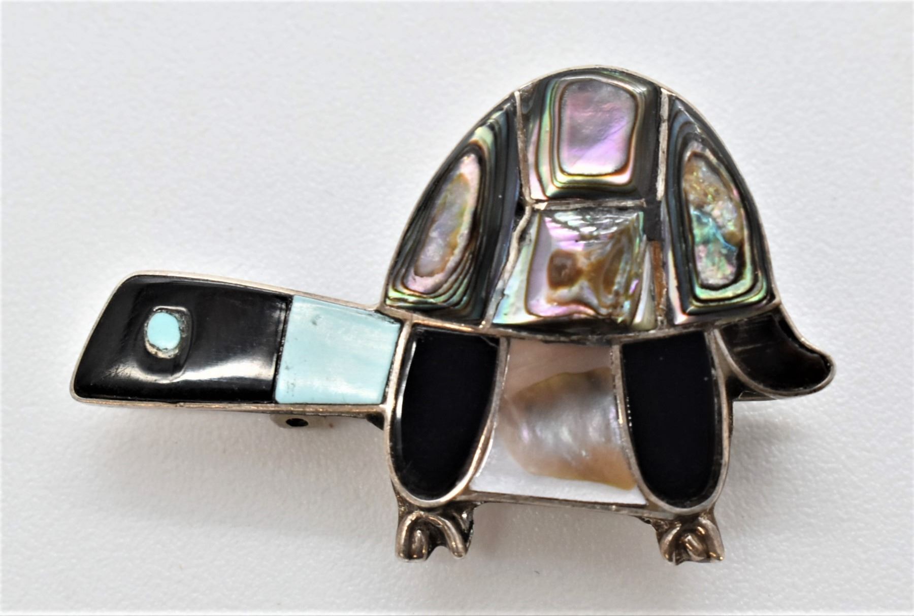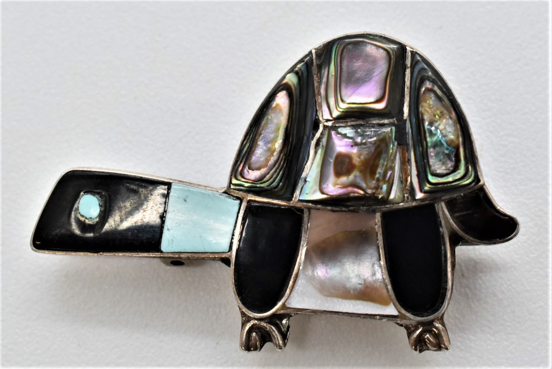 Native American Zuni Sterling Inlay Turtle Pin Pendant by E. Gia, measures 1.5'' x 1''W, beautiful inlay of turquoise, jet, abalone, pink mother of pearl, and jasper