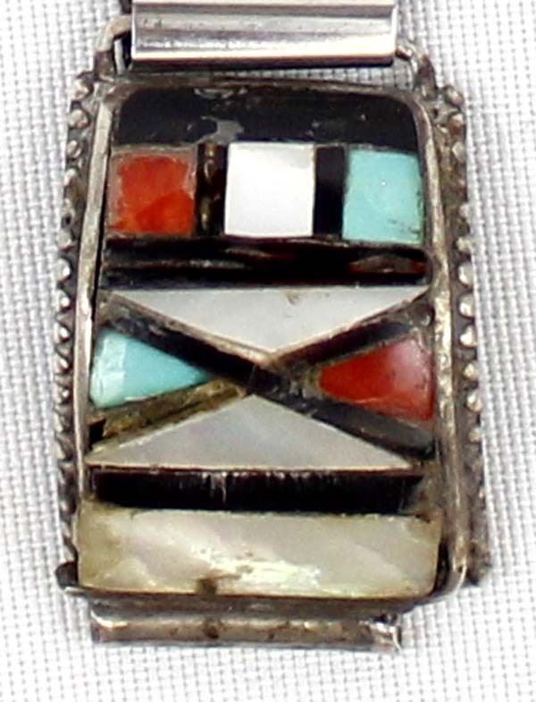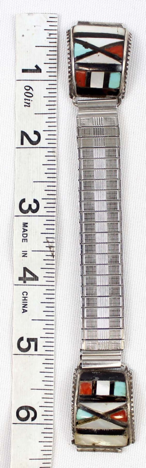 Native American Zuni Sterling Inlay Watch Band by Herbert and Esther Cellicion, tips measure 1'' x 1.25'' and is hallmarked, missing piece of onyx (.5'')