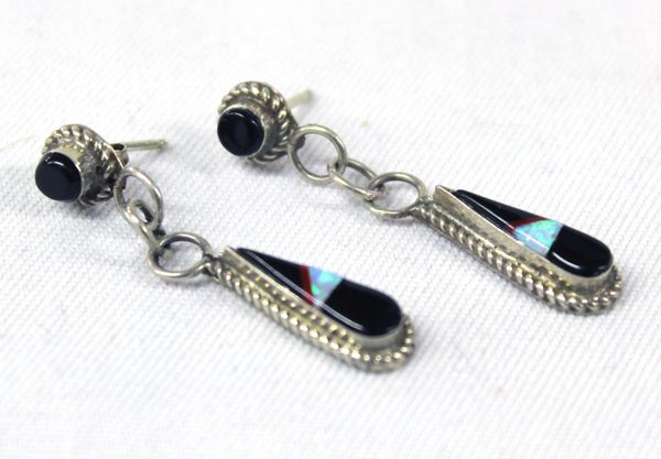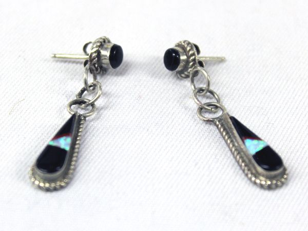 Zuni Sterling Jet & Opal Pierced Earrings. Sweet Zuni dangle earrings, measuring 1.5'' in length and .25'' in width.
