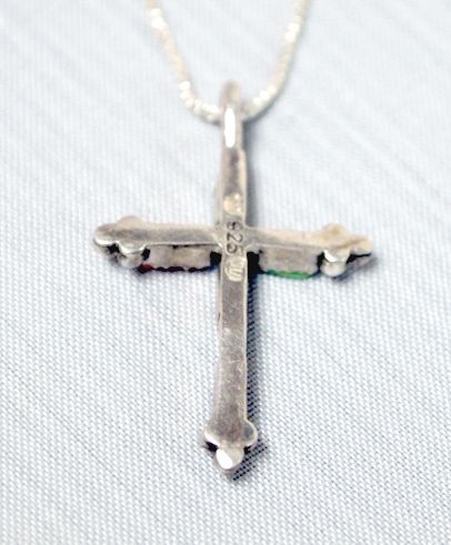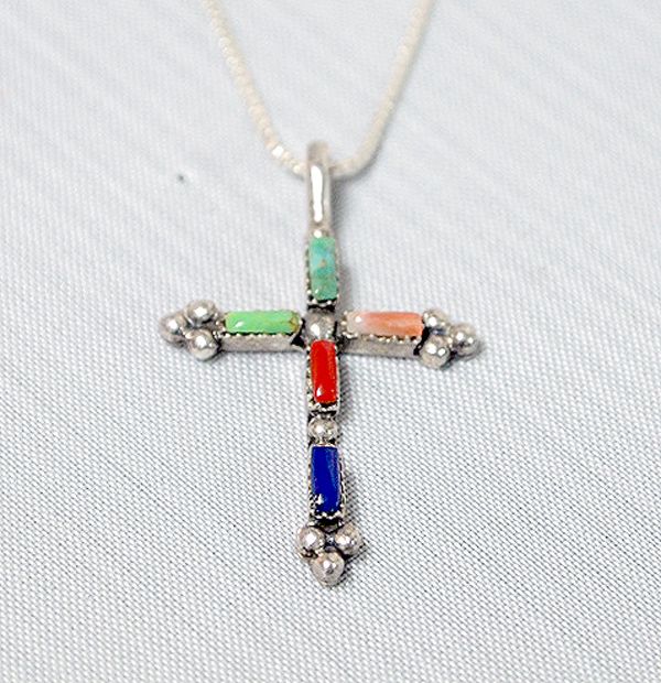 Zuni Sterling Needlepoint Cross Pendant Necklace, cross measures 1.25''L x .75''W and chain measures 18'' end to end, cross features turquoise-lapis-pink shell-coral, & Gaspeite. 1.6g silver