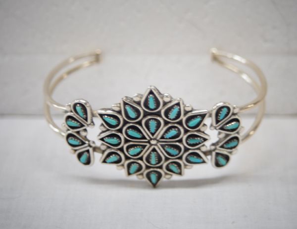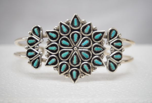 Zuni Sterling Needlepoint Turquoise Bracelet, inside measures 6.75'' which includes opening x 1.5''W, features 26 beautiful blue green needlepoint turquoise stones, double band, 20.7g in total wt.