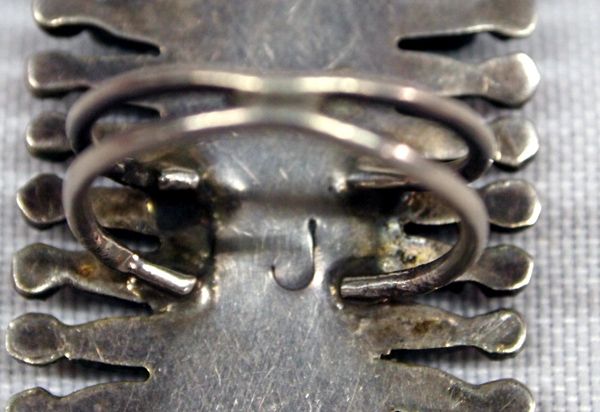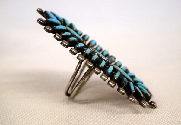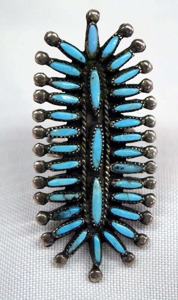 Zuni Sterling Needlepoint Turquoise Ring, hallmarked J, stunning oval in shape featuring 32 light blue turquoise needlepoint cabs accented with silver beadwork, one stone is cracked, size 7 and measures 2.25''L x 1''W, double band shank