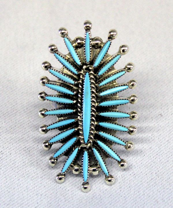 Native American Zuni Sterling Petit Point Turquoise Ring. Expertly crafted petit point Sleeping Beauty turquoise ring by Lorraine Waatsa. The stones radiate from the center in an oval configuration, culminating in sterling beads. A simple rope pattern encircles the center stone. The ring is a size 8 and is signed by the artist.