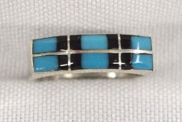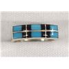 Native American Zuni Sterling Silver Jet and Turquoise Channel Inlay Ring, Size 7, measures .25''W, 2.67g in total wt.
