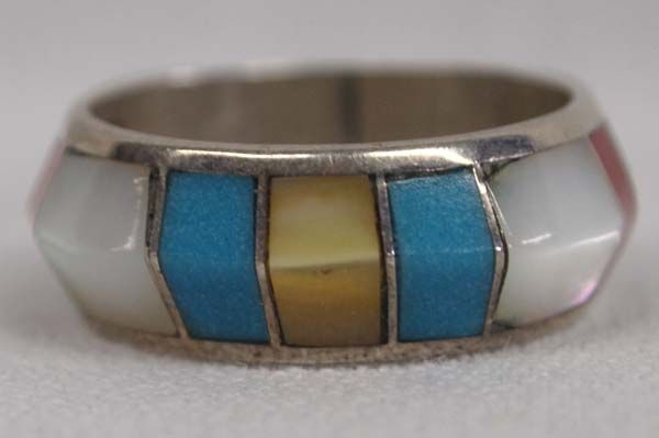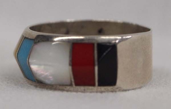 Zuni Sterling Silver Channel Inlay Ring, Size 8.5, jet-coral-mother of pearl-turquoise, measures .5''W, 3g in total wt.