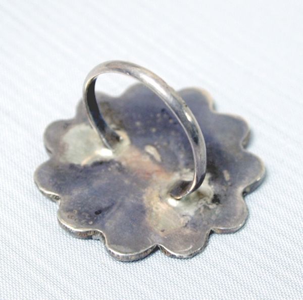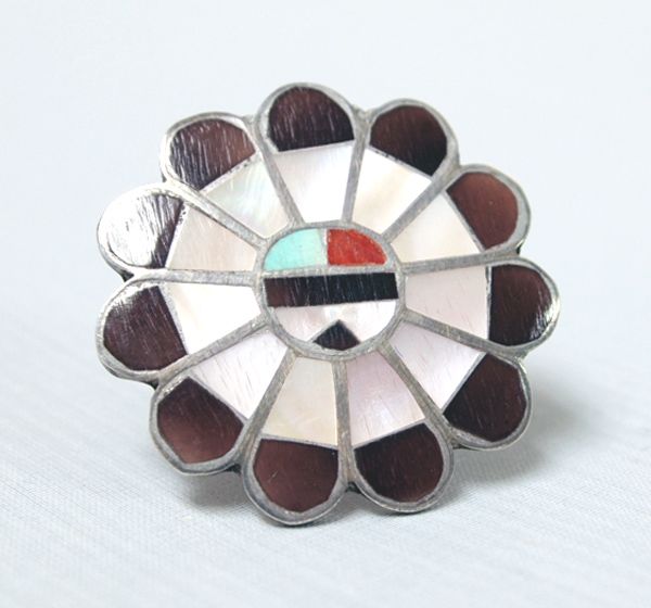 Zuni Sterling Silver Channel Inlay Sun God Ring, size 10, onyx-mother of pearl-turquoise-coral