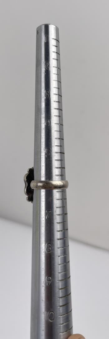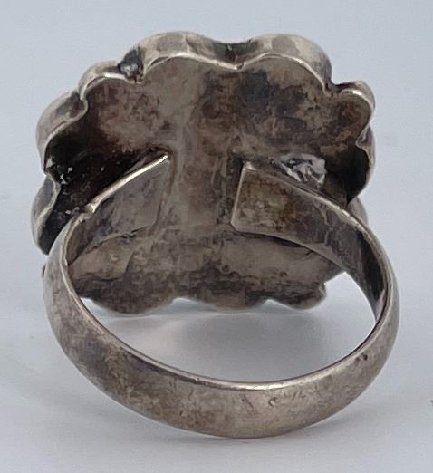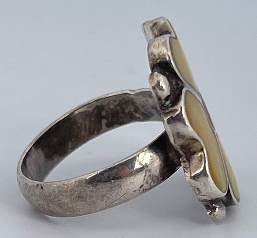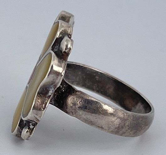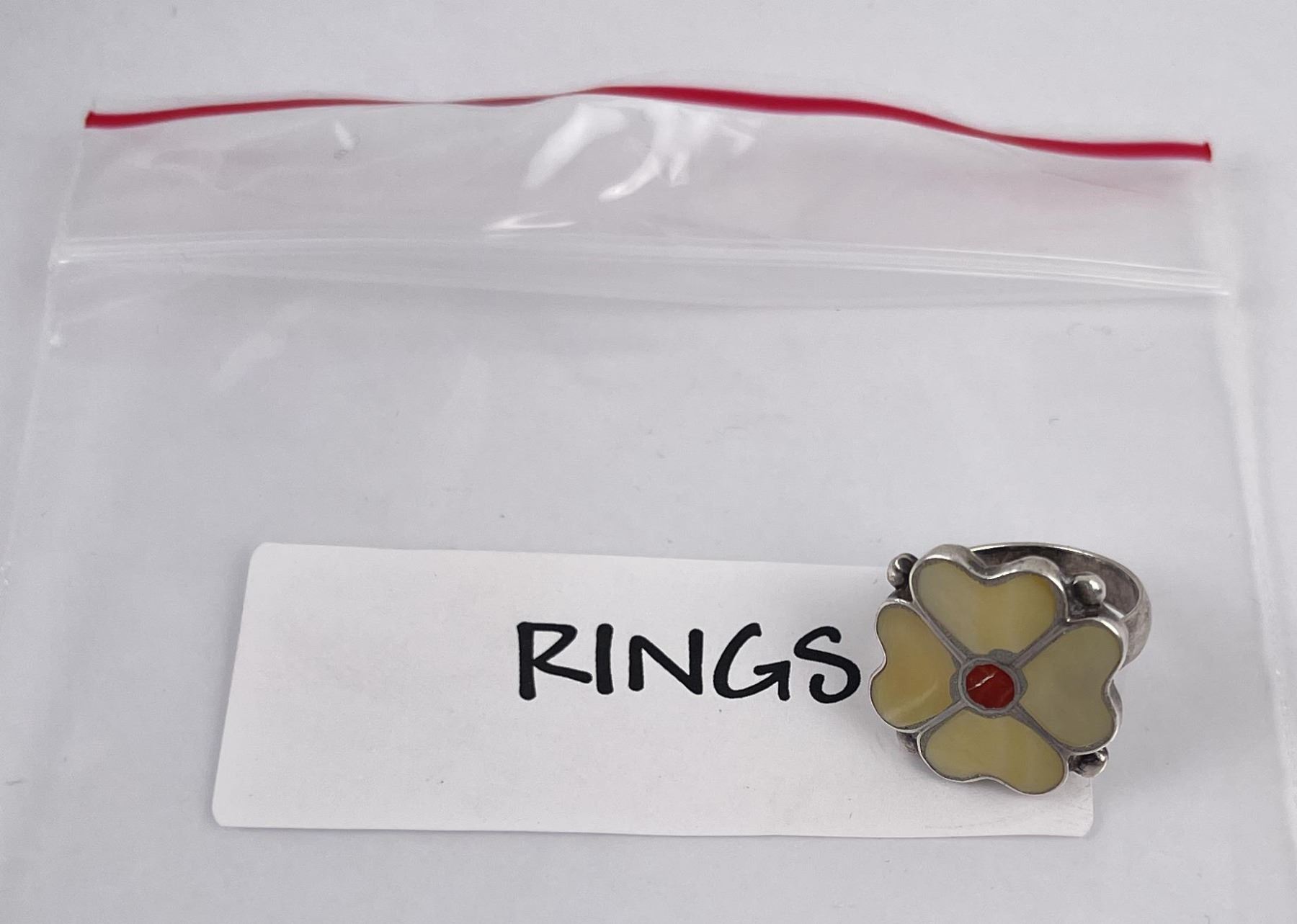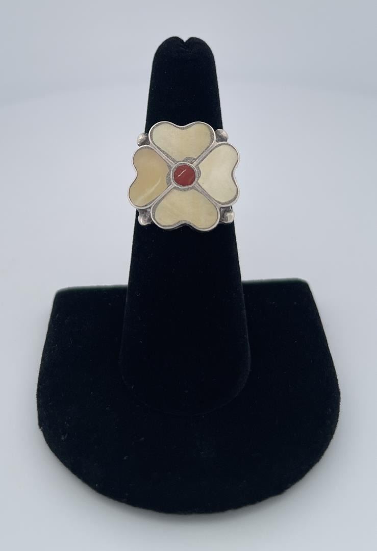 Flower shaped, inlaid with red coral and mother of pearl. Size 6, maker stamp not evident.