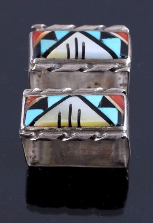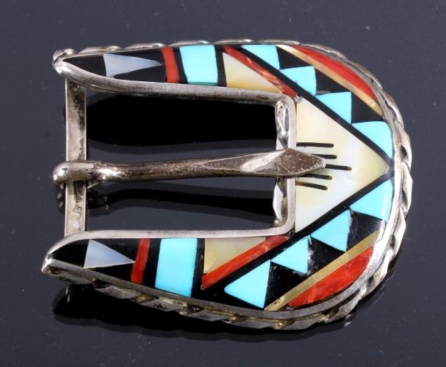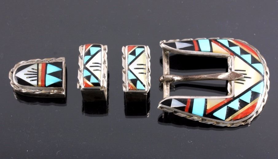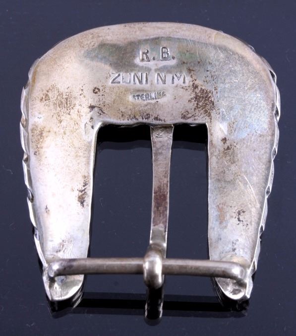 This is a Zuni signed sterling silver inlaid ranger buckle set. The set includes a buckle, tip, and two loops. Each piece is inlaid with turquoise, coral, onyx and mother of pearl. The back of the buckle is signed "R.B. Zuni N.M." and is marked "Sterling". The Zuni ranger buckle set is in good condition. The buckle measures 1.5" x 1.75". The set will accommodate a .75" wide belt.