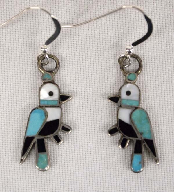 Native American Zuni Sterling Silver Inlay Bird Earrings, measure 1'' x 1.25''L, inlay stones included are turquoise, jet, and mother of pearl