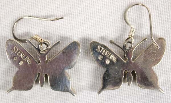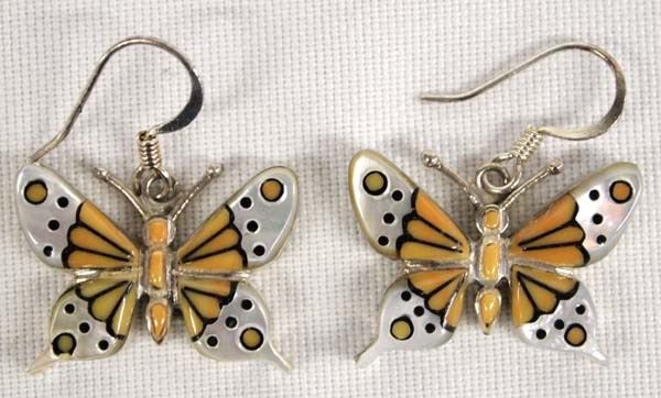 Native American Zuni Sterling Silver Inlay Butterfly Earrings, hallmarked CO and stamped sterling, inlay includes angel coral, jet, and mother of pearl
