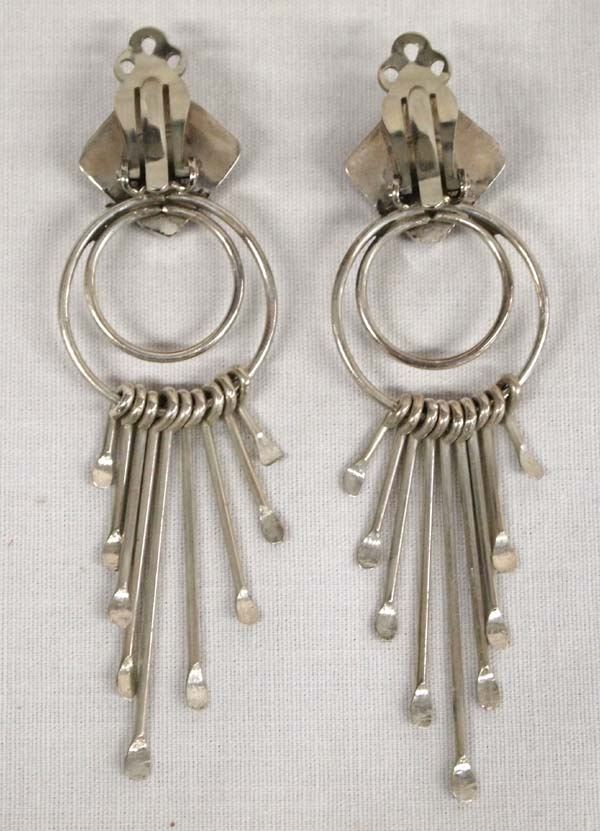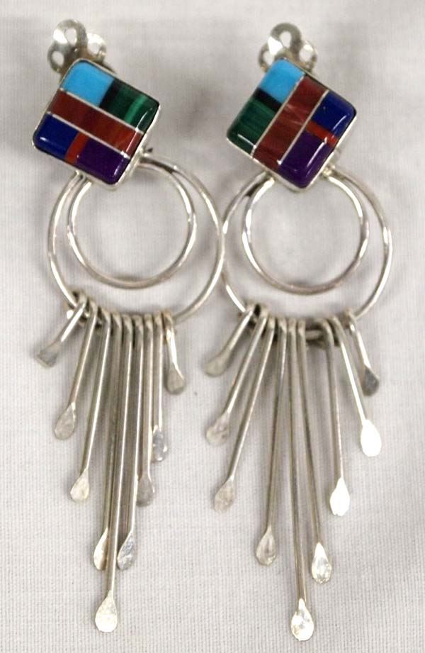 Native American Zuni Sterling Silver Inlay Clip-on Earrings, measure 2.5''L x .75''W, inlay includes malachite, turquoise, red shell, coral, lapis, and sugilite, 9.2g in total wt.