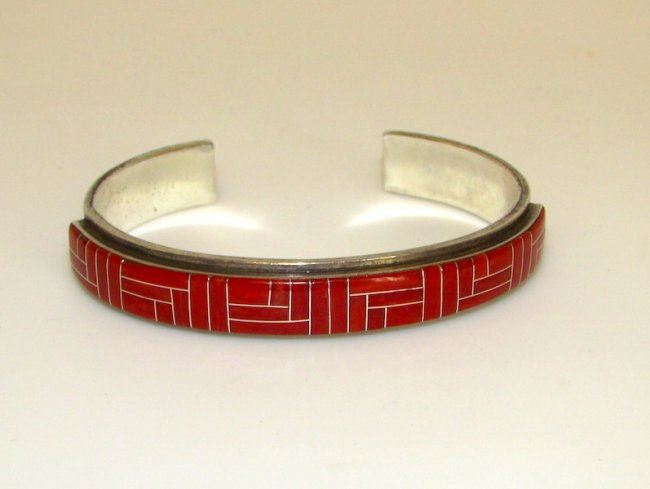 For your consideration is this fabulous vintage sterling silver coral inlay cuff bracelet in wonderful vintage condition by a talented and collectible Zuni artist from the Eriacho family. The inside circumference of the cuff is about 7 1/2" and it can be carefully adjusted. Stamped "sterling" and signed with the artist's hallmark.