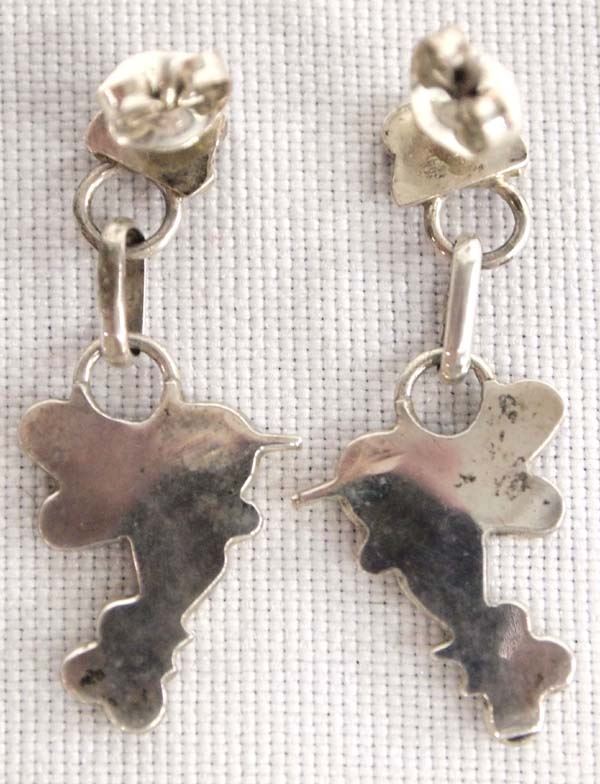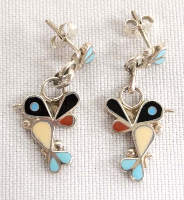 Native American Zuni Sterling Silver Inlay Hummingbird Earrings, measures 1 1/8''H x .5''W, inlay includes turquoise coral, jet, and mother of pearl, 2.6g in total wt.