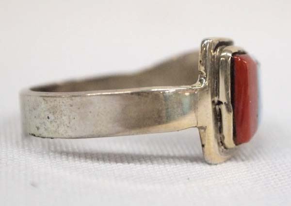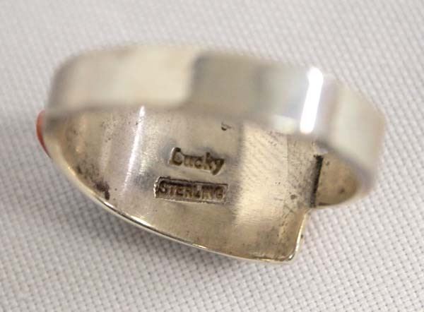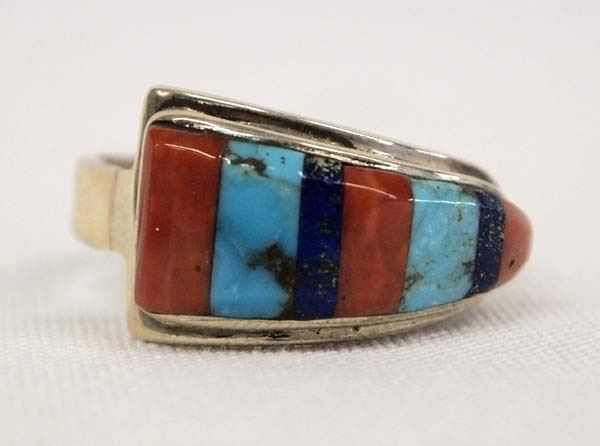 Native American Zuni Sterling Silver Inlay Ring, Size 14, inlay includes coral, lapis, and turquoise, signed Lucky and stamped sterling