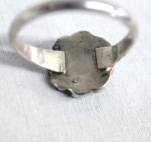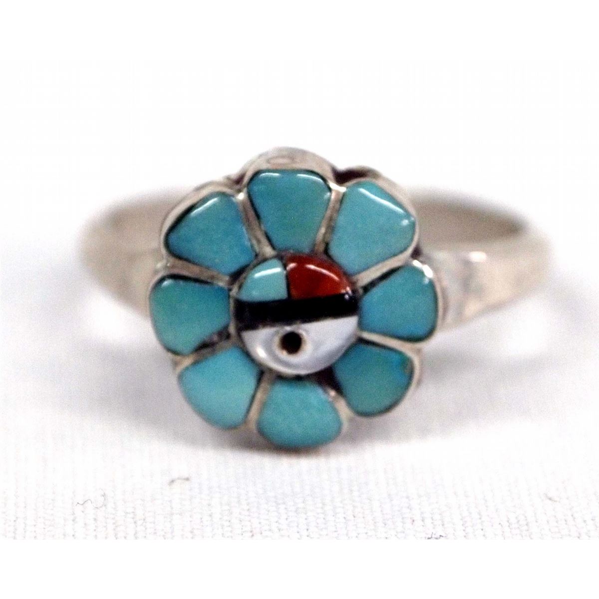 Dainty Native American Zuni Sterling Silver Inlay Sun God Ring, Size 8, measures .5''D, includes both channel and stone to stone inlay of turquoise, coral, jet, and mother of pearl, 2.45g in total wt.