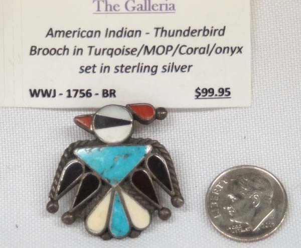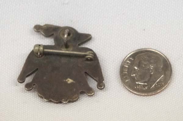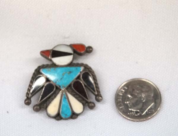 Native American Zuni Sterling Silver Inlay Thunderbird Pin Pendant, inlay includes jet, coral, mother of pearl, and turquoise, measures 1.25''L x 1''W