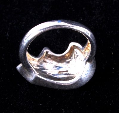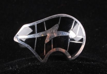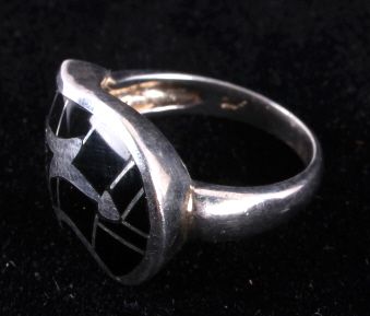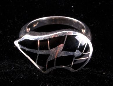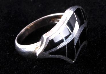 The ring is Sterling Silver with inlaid Jet stone from the Zuni Native Americans. Size 6.5.