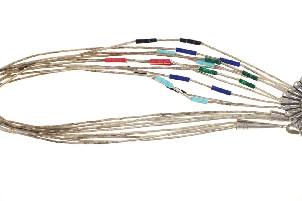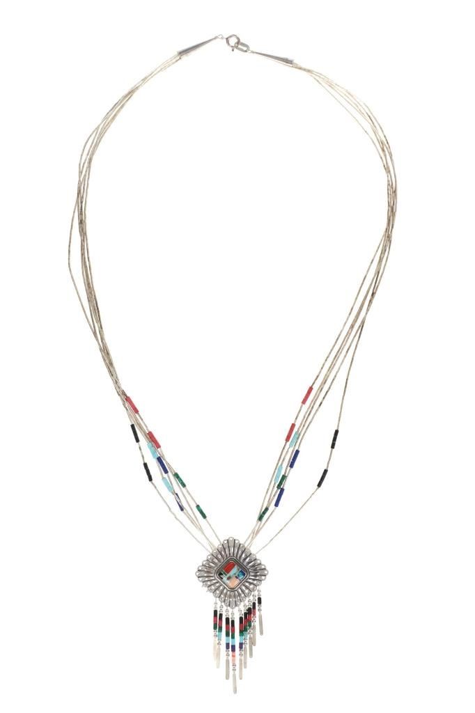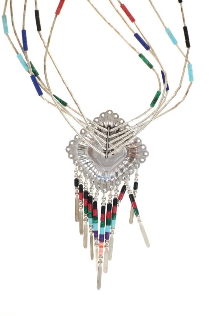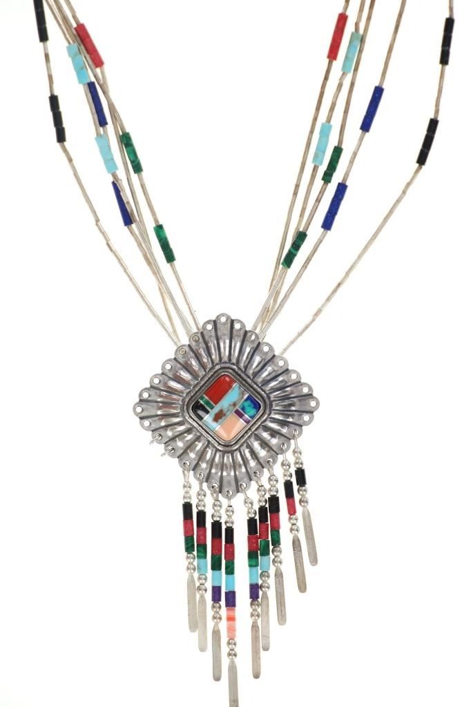Featured in this lot is this Zuni sterling silver multistone inlay necklace circa 20th century. The necklace features a wonderfully and professionally crafted sterling silver and multistone inlay construction that shows a link multi strand chain with cylindrical beads that include: malachite, lapis lazuli, turquoise, and red branch coral. The pendant features a sterling silver frame with inlay mosaic design with cripple creek turquoise, red branch coral, onyx, malachite, and opal construction that shows a dangle design with rods that includes similar bead arrangements as the strands. The pendant and aglets are marked as follows: Sterling. The condition of this Navajo necklace is good with no obvious signs of damage and shows good overall condition. The measurements of this necklace from clasp to clasp is 24" and the central pendant measures 3" x 1 1/2". The collective weight of this necklace is 22.3g.