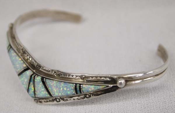 Zuni Sterling Silver Opal Bracelet by Henry Addikie, hallmarked H and stamped sterling, beautiful stone to stone and channel inlay, 15g in total wt.