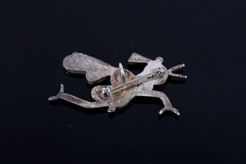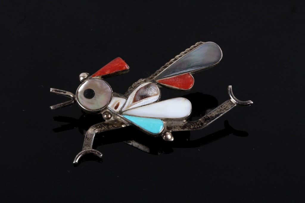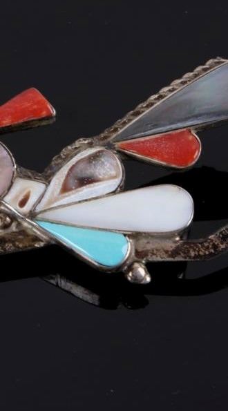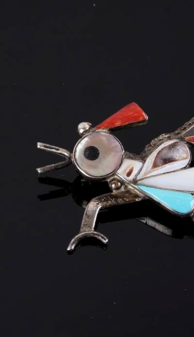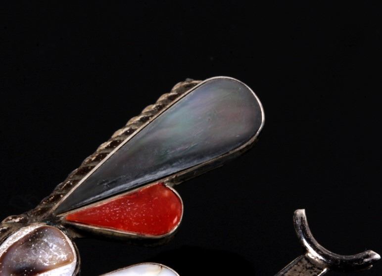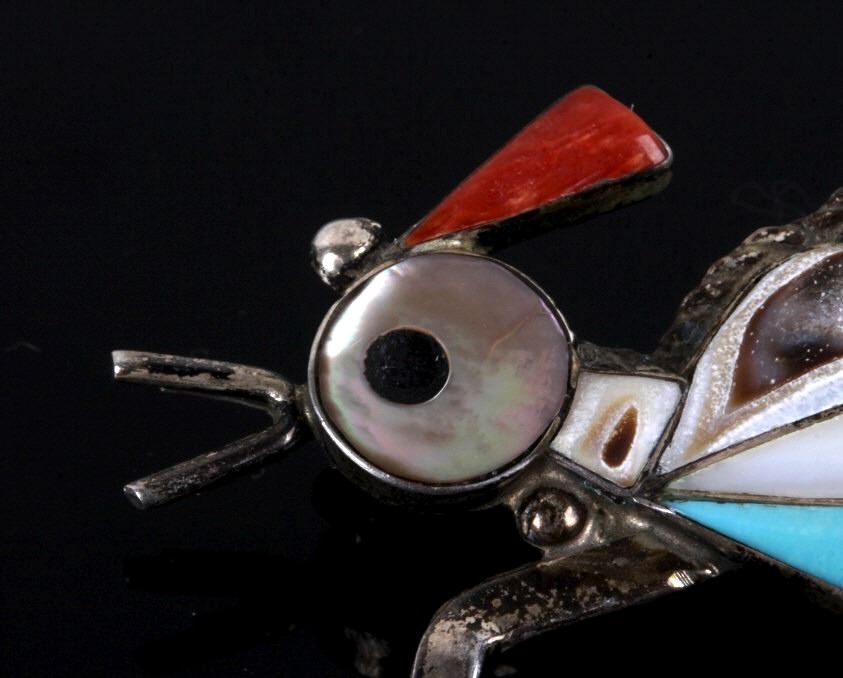 Available for your bidding pleasure is this Zuni Native American Sterling Silver Road Runner Brooch. This pendant shows a multi-stone construction such as Fox Turquoise, Abalone, and Branch Coral. The brooch also features three polished silver nuggets. This piece shows excellent quality and condition and measures 2" wide and 1" tall.