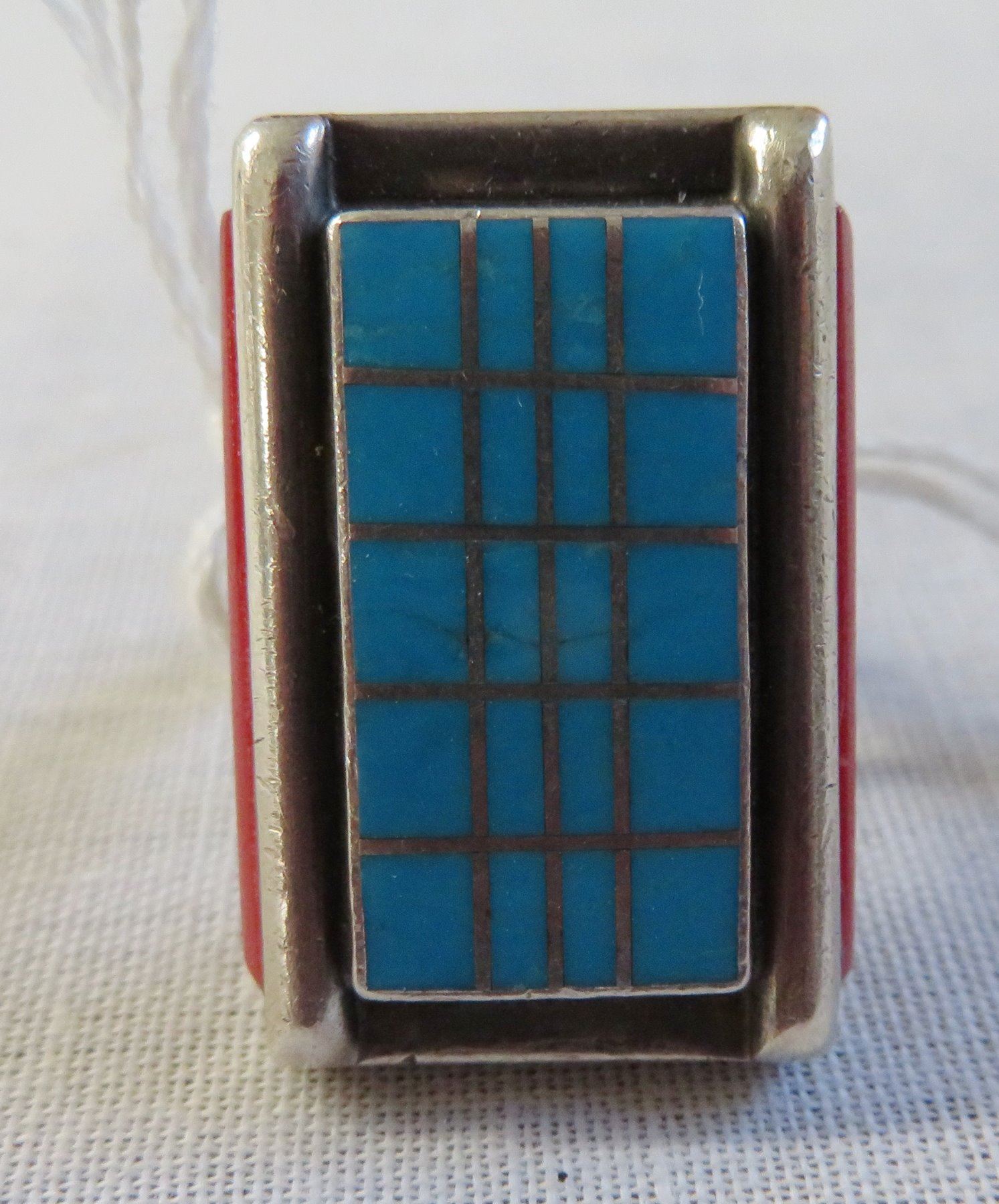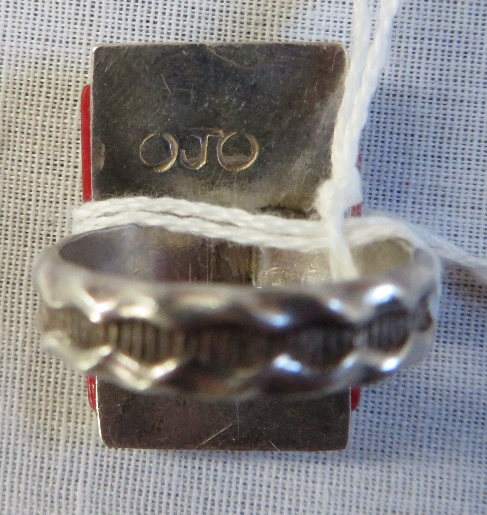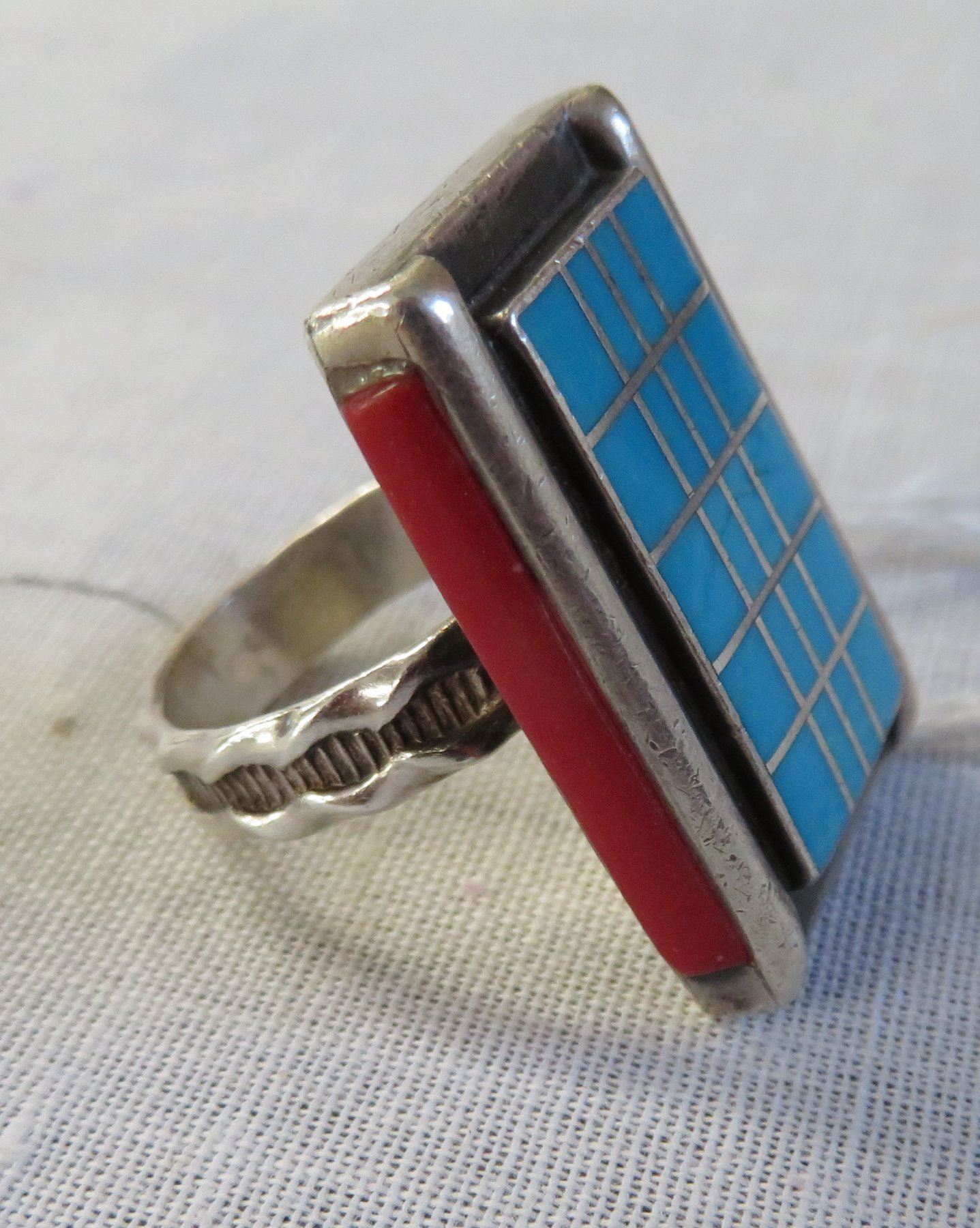 Zuni Sterling Silver & Stone Ring, c. 1960s. Made of sterling silver, turquoise and coral, the item measures 1" x 5/8" x 1", ring size 7 1/4. Marked OJO. Weighs approx. 11.6 grams. Fancy stamping on outside of band; unique coral setting on edges and turquoise grid pattern. Weighs approx. 11.6 grams. Condition: Good patina, see images. Shipping: $10.50 w/insurance and signature.