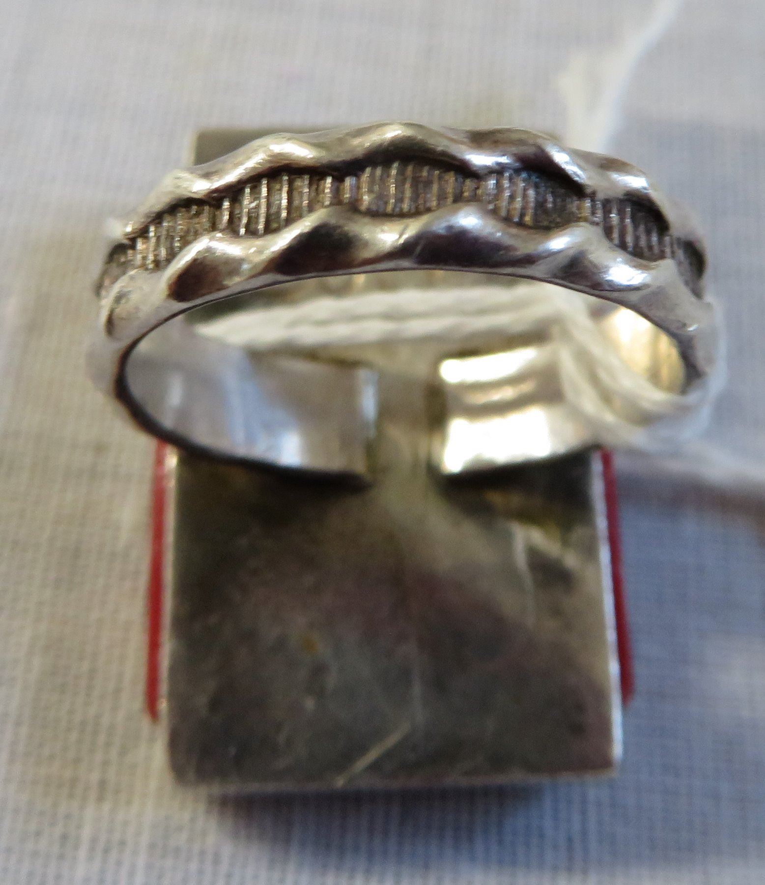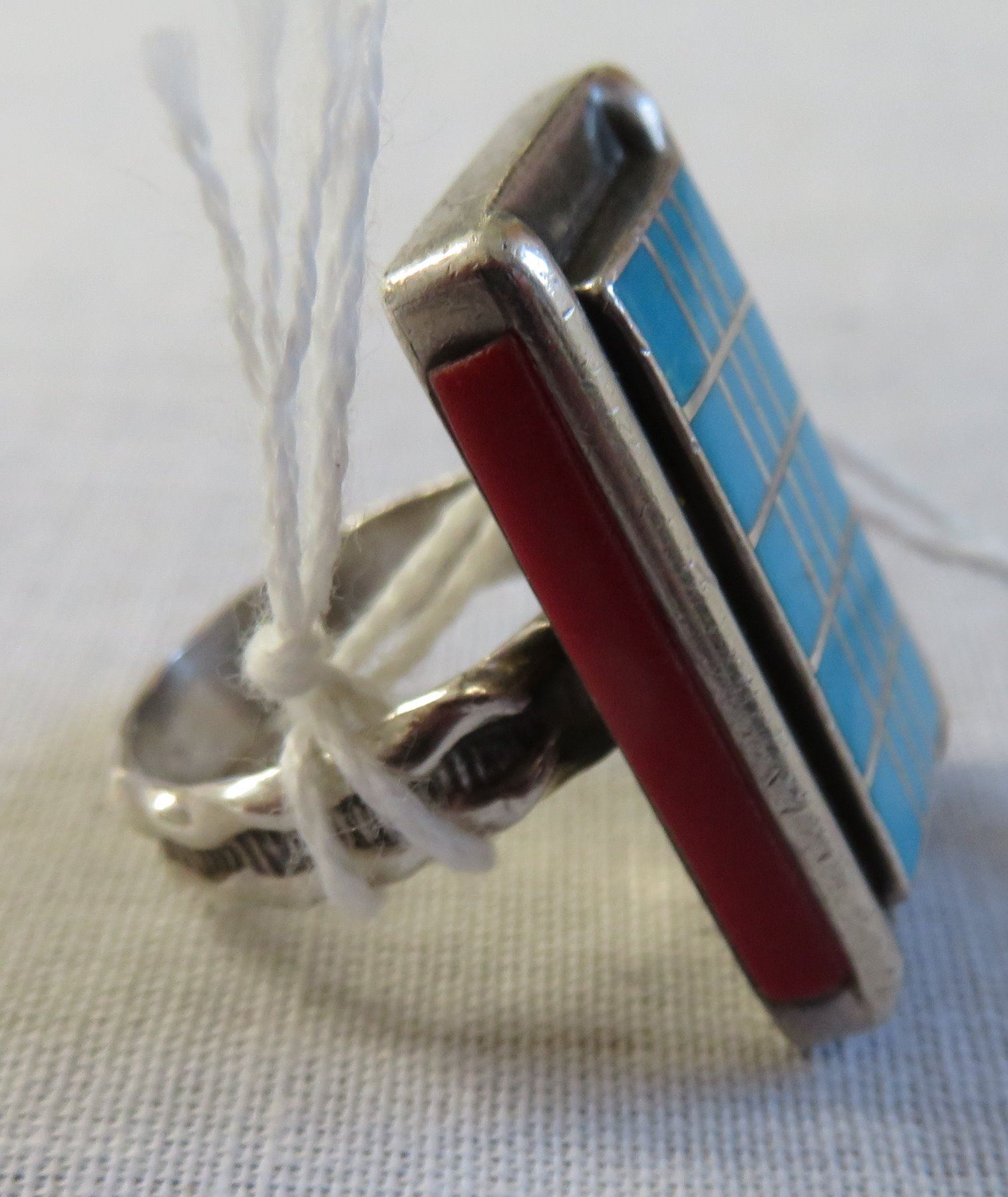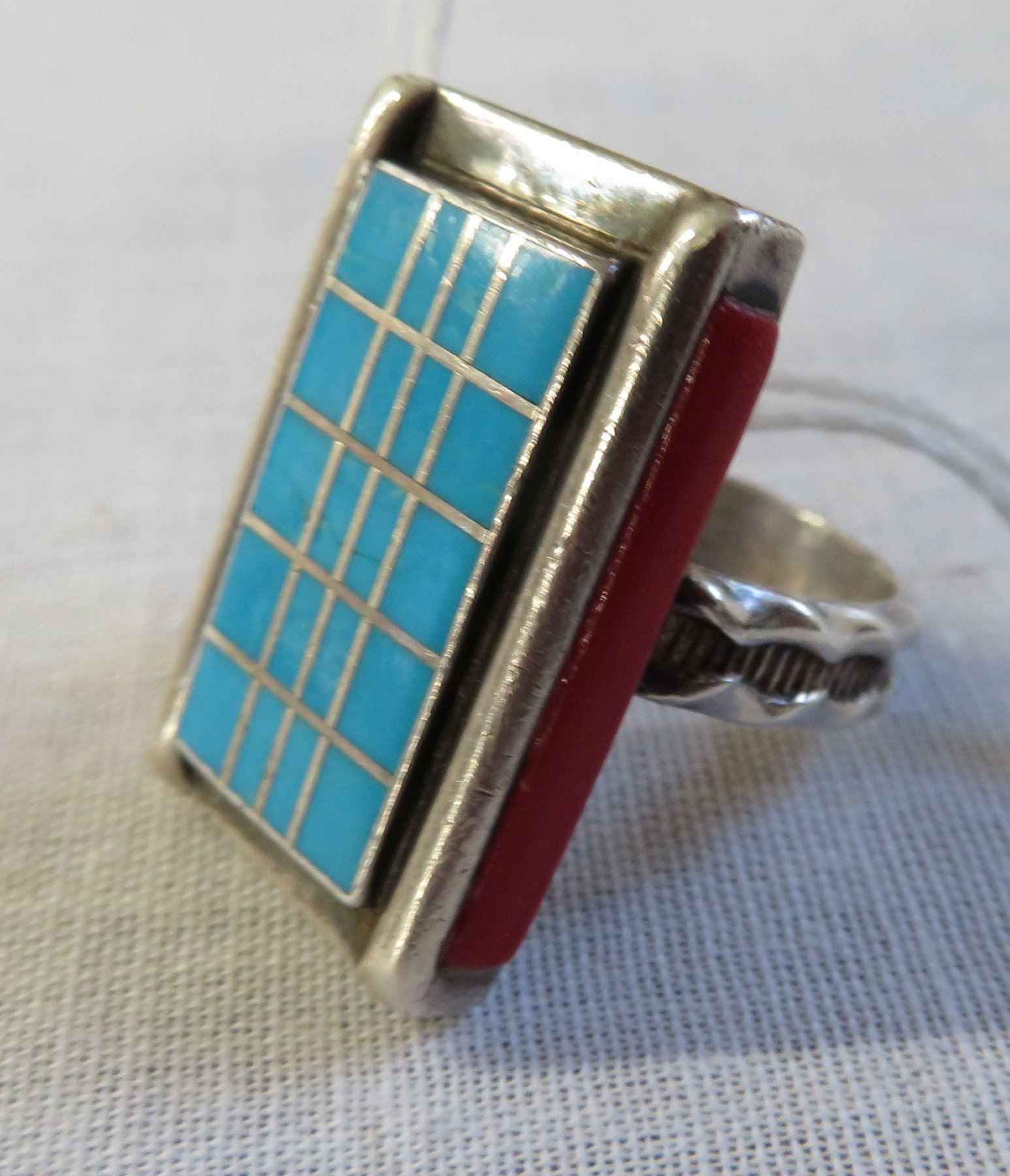 Zuni Sterling Silver & Stone Ring, c. 1960s. Made of sterling silver, turquoise and coral, the item measures 1" x 5/8" x 1", ring size 7 1/4. Marked OJO. Weighs approx. 11.6 grams. Fancy stamping on outside of band; unique coral setting on edges and turquoise grid pattern. Weighs approx. 11.6 grams. Condition: Good patina, see images. Shipping: $10.50 w/insurance and signature.