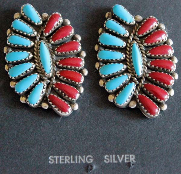 Zuni Sterling Silver Turquoise & Coral Earrings. Older pair of post-style earrings with turquoise and coral set in a petit point style. Measures 1 5/8'' x 1 3/8''. Stamped ''Sterling''.