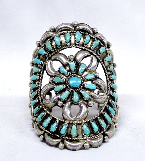 Native American Old Pawn Zuni Sterling Silver Turquoise Cuff Bracelet, Crescent Moon design, 42 Blue Gem Mine Turquoise stones and bracelet tests as ''sterling silver'' although it is not hallmarked as such, no artist mark or name but this is not unusual for the older pieces, bracelet measures an impressive 3 7/8''H, inside circumference is 5.75'' PLUS 1 5/8'' gap for a little flexibility for adjustment, an incredible addition to your collection and a definite statement piece---HUGE!