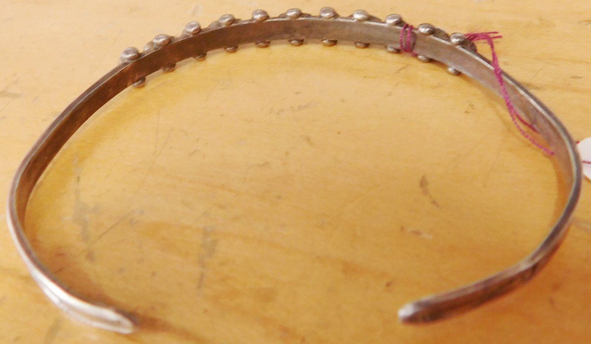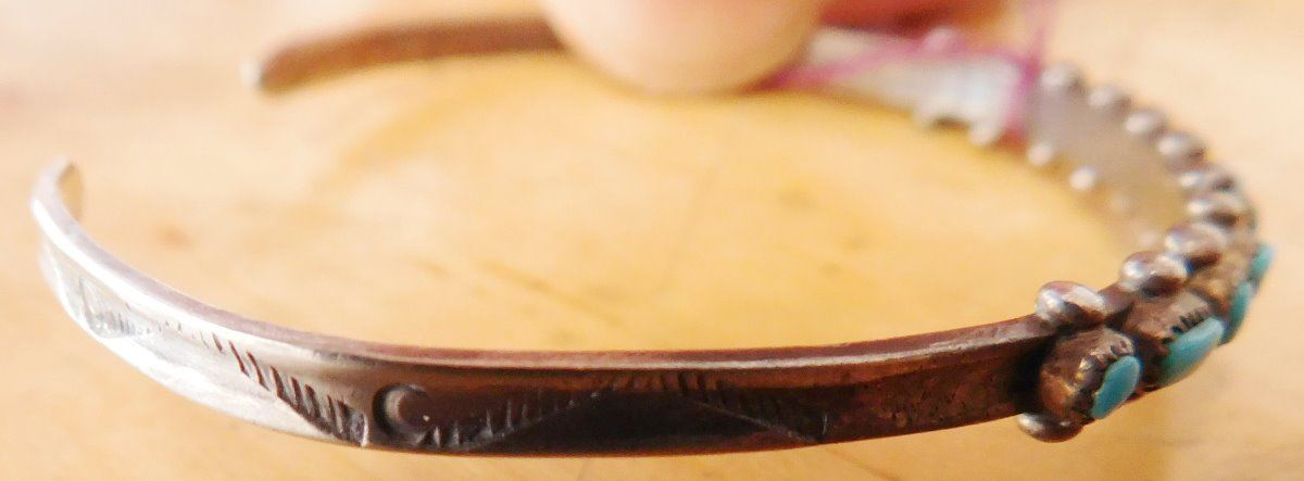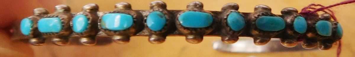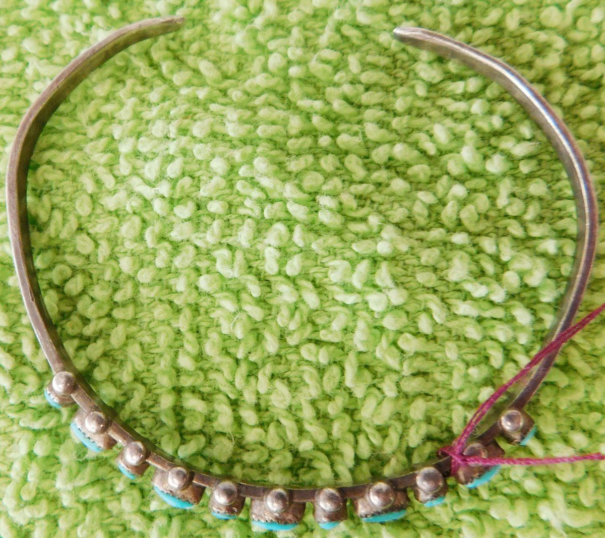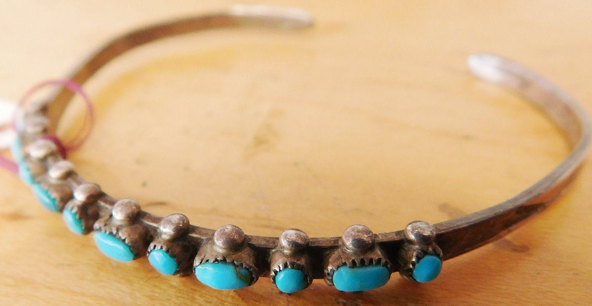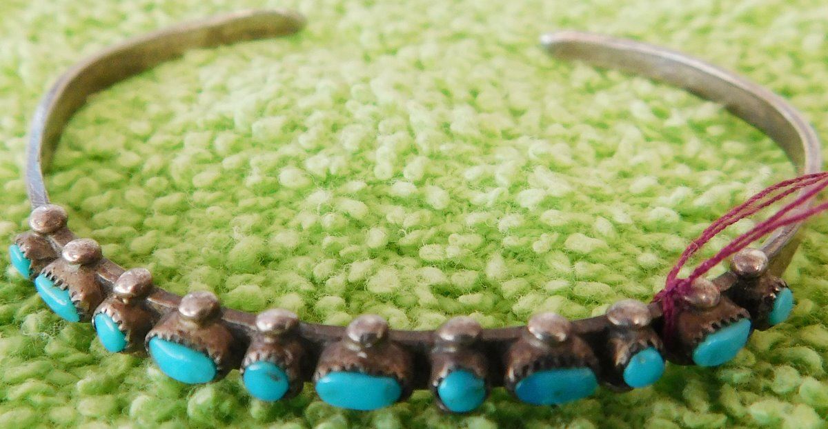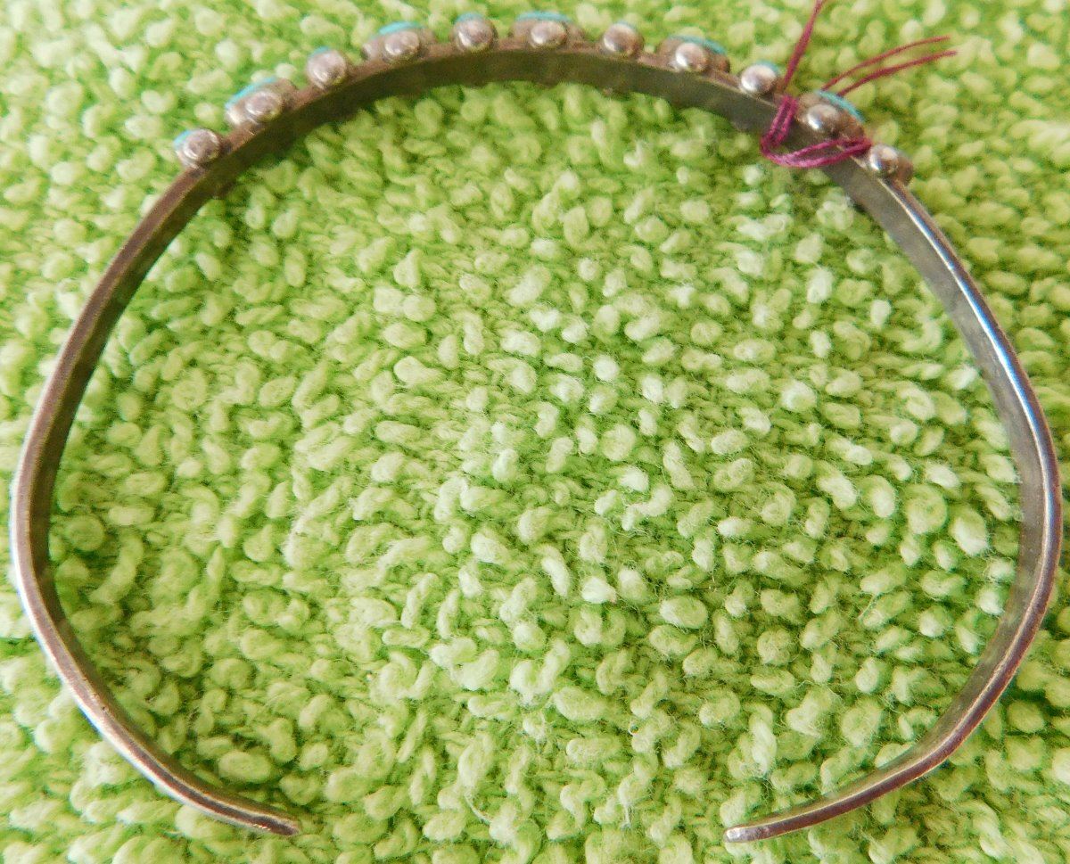 Zuni Sterling Silver & Turquoise Cuff, circa 1940s. Made of sterling silver and turquoise, the item is 2.25" X 2", 1" opening and a 5.25" inside measurement. Zuni, New Mexico. Very fance stonework, silver beading and stamping on this 5.7 gram cuff. Condition: Great patina, see images. Shipping: $14.50 w/insurance and signature.