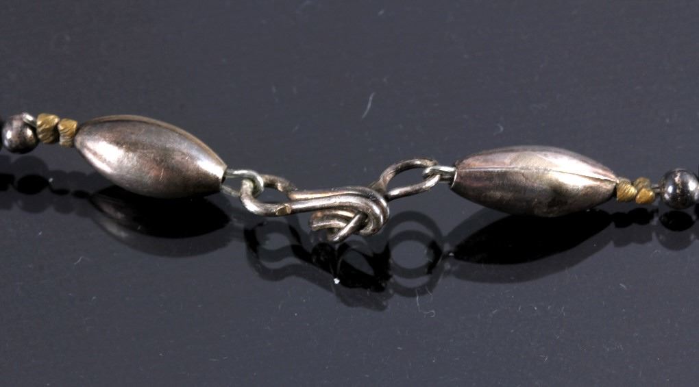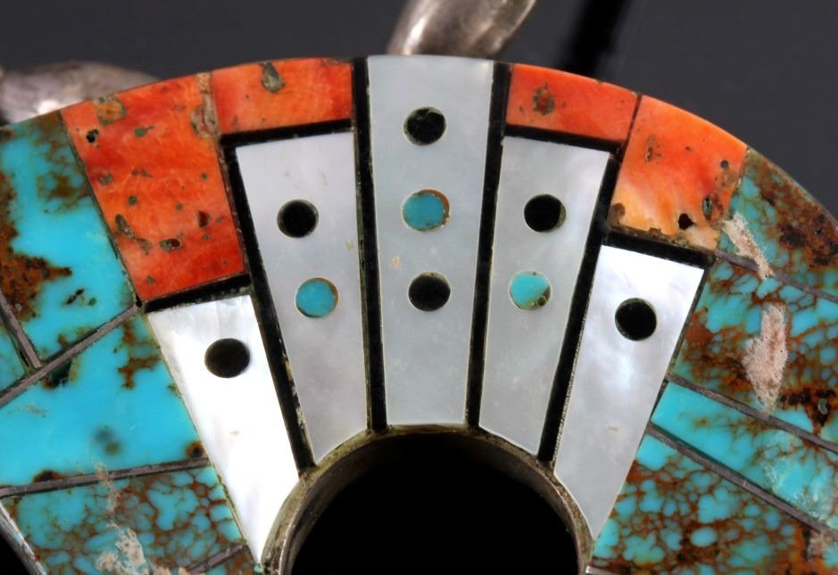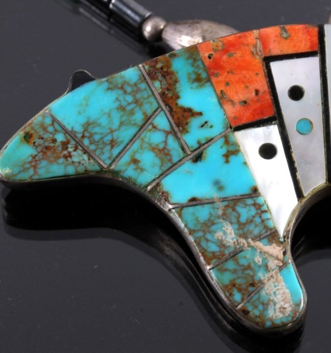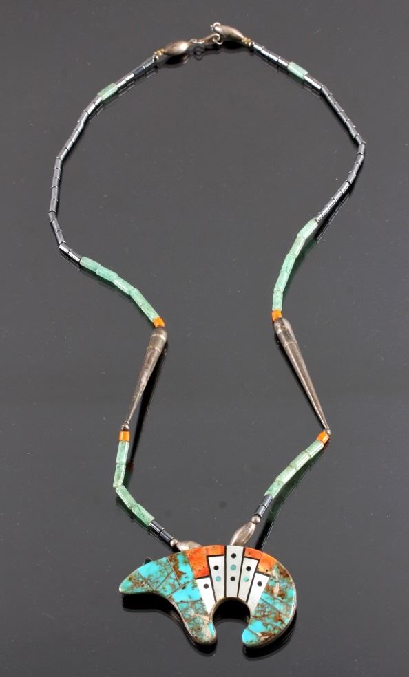 This is a Zuni Native American Indian sterling silver with turquoise inlaid mosaic bear necklace. The bear mosaic pendant is inlaid with Cripple Creek Turquoise, coral and mother of pearl. The pendant is fitted with a pinback and can be unclipped from the necklace to be worn as a brooch. The necklace is composed of aventurine, hematite, coral and silver cone beads. The Zuni bear necklace is in good condition. The pendant measures 1.5" x 2.5" and the necklace is 25.5" long.