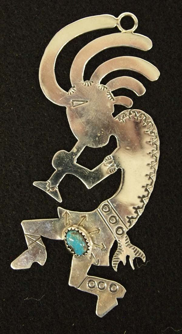 Native American Zuni Sterling Silver Turquoise Kokopelli Pendant by Brian Panteah, measures 4'' x 1.5'', hallmarked and stamped Sterling