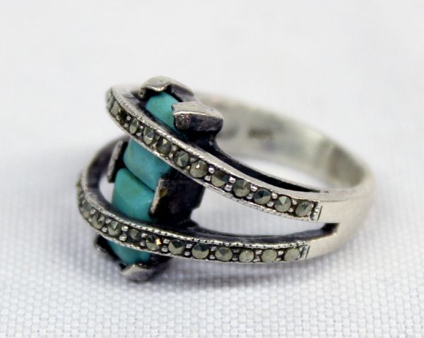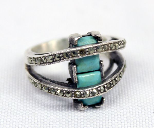 Zuni Sterling Silver Turquoise & Marquisite Ring. Interesting piece of estate jewelry, bands of marquisite (one tiny stone missing). Beneath the split bands are square faceted turquoise cabochons, prong set. It is stamped ''925''. Size 6.5, 5/8'' wide.