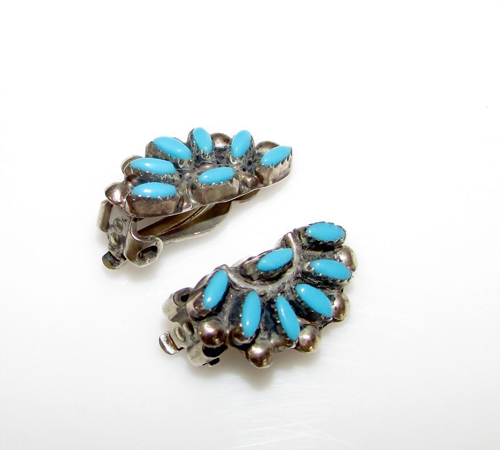 For your considerations is a pair of these lovely, delicate vintage Zuni sterling silver and needlepoint design Sleeping Beauty mine turquoise clip on earrings in wonderful vintage condition. The earrings measure about 3/4" long. The earrings are unmarked as most pieces from the time period.