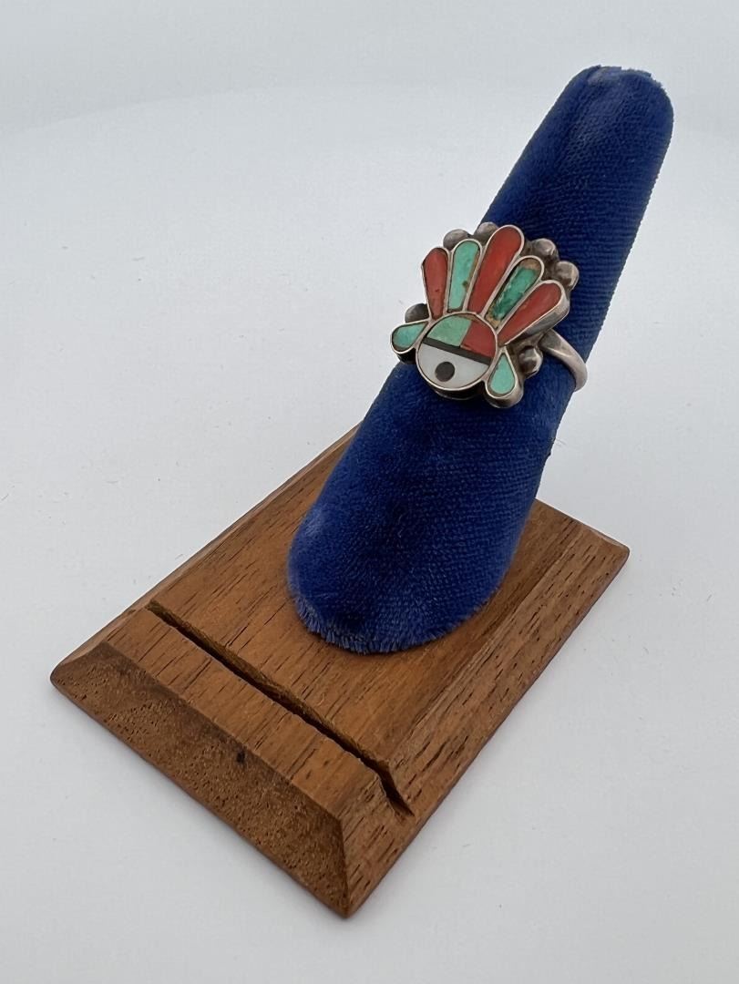 Sunface Chief design inlaid with turquoise and coral. Nice Old Pawn ring, no receipt. Size 6 1/2