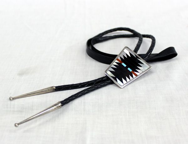 Zuni Sterling Stone to Stone Inlay Bolo Tie, slide measures 1.75''H x 1.5''W and fine leather strap 38''L, trapezoid shaped, exquisite stone to stone inlay in mother of pearl, coral, jet, and turquiose in serrated diamond pattern, a true work of art