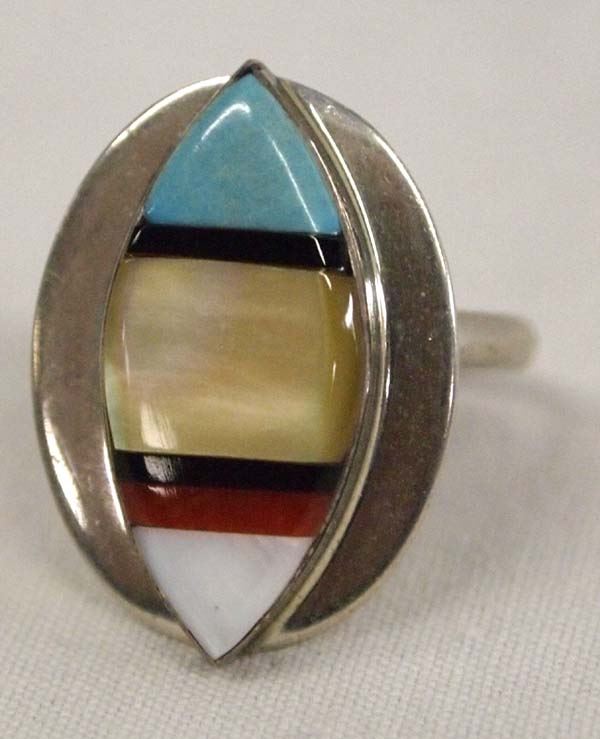 Sweet Native American Zuni Sterling Stone to Stone Inlay Ring, Size 5.5, measures .75''L, inlay stones include turquoise, gold lip shell, mother of pearl, coral, and jet, 2.8g in total wt.