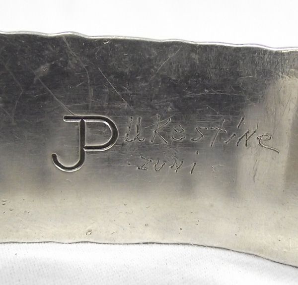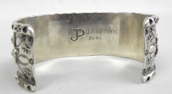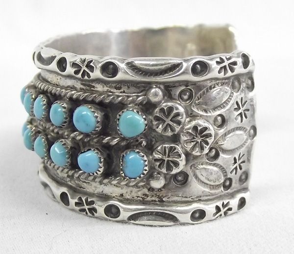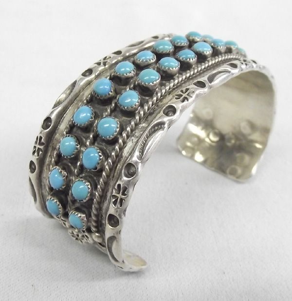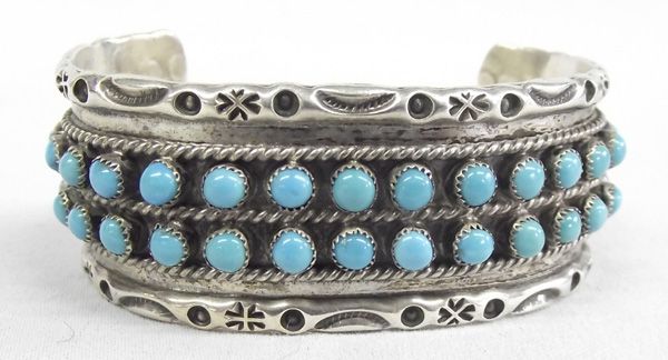 Zuni Sterling Petit Point Turquoise Bracelet - Jason & Pearl Ukestine (JP), nice older bracelet, good weight, 30 (1/8"D) turquoise cabochons, inside measures 6.5'' which includes gap x 1''W, gorgeous hand stamped accents, twisted silver rope accents between rows of stones, a truly stunning piece