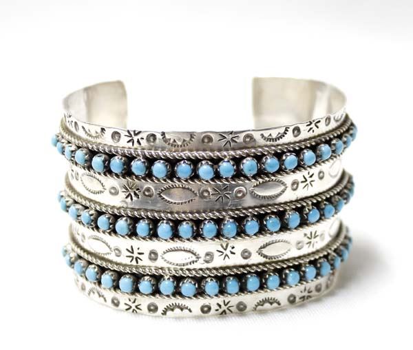 Stunning Native American Zuni Sterling Silver Turquoise Bracelet by Jason and Pearl Ukestine, beautiful sterling silver set with Sleeping Beauty Turquoise cabochons, hallmarked JP, inside measures 6.5'' which includes opening x 1.75''W, 53.8g in total wt.