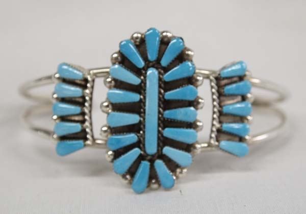 Lovely Native American Zuni Sterling Silver Petit Point Turquoise Bracelet by Vera Halusewa, inside measures 6.5'' which includes opening x 1.25''W, hallmarked and stamped sterling, 15.98g in total wt.