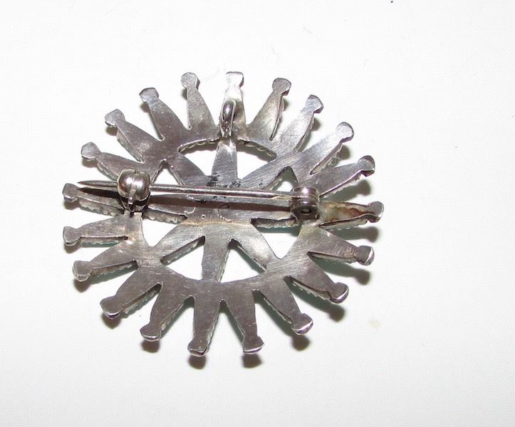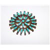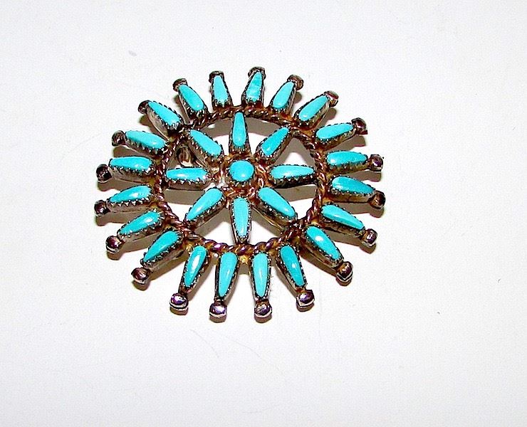 For your consideration is this exquisite Old Pawn Native American Zuni sterling silver turquoise cluster brooch pendant in wonderful vintage condition. This fabulous piece features a traditional Zuni design in sterling silver accented with Sleeping Beauty mine turquoise cluster design. The brooch is unmarked as all Old Pawn jewelry and has been tested for silver content. Measures a about 1 1/2" in diameter. Stunning example of vintage Native American art to add to any collection!