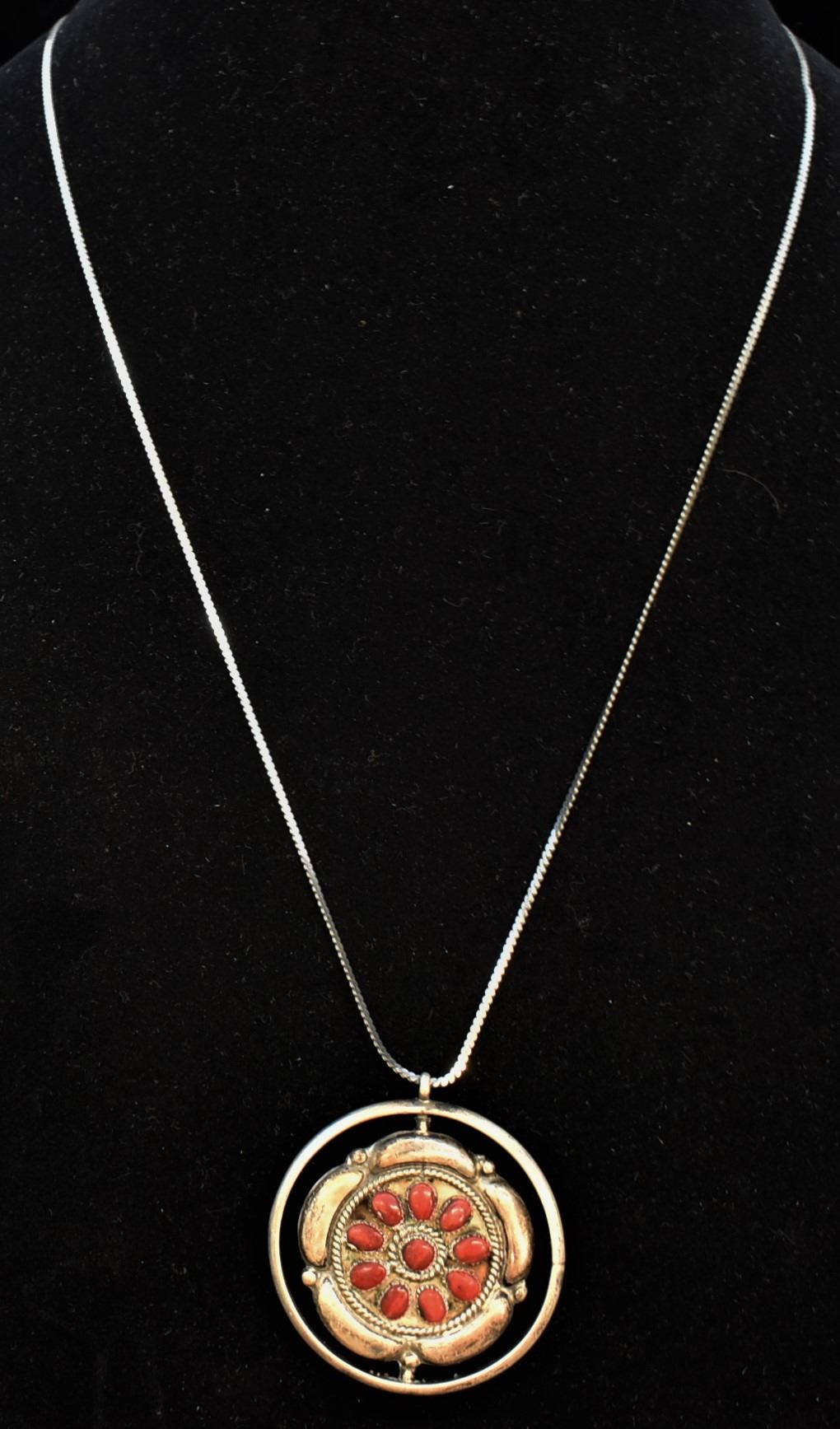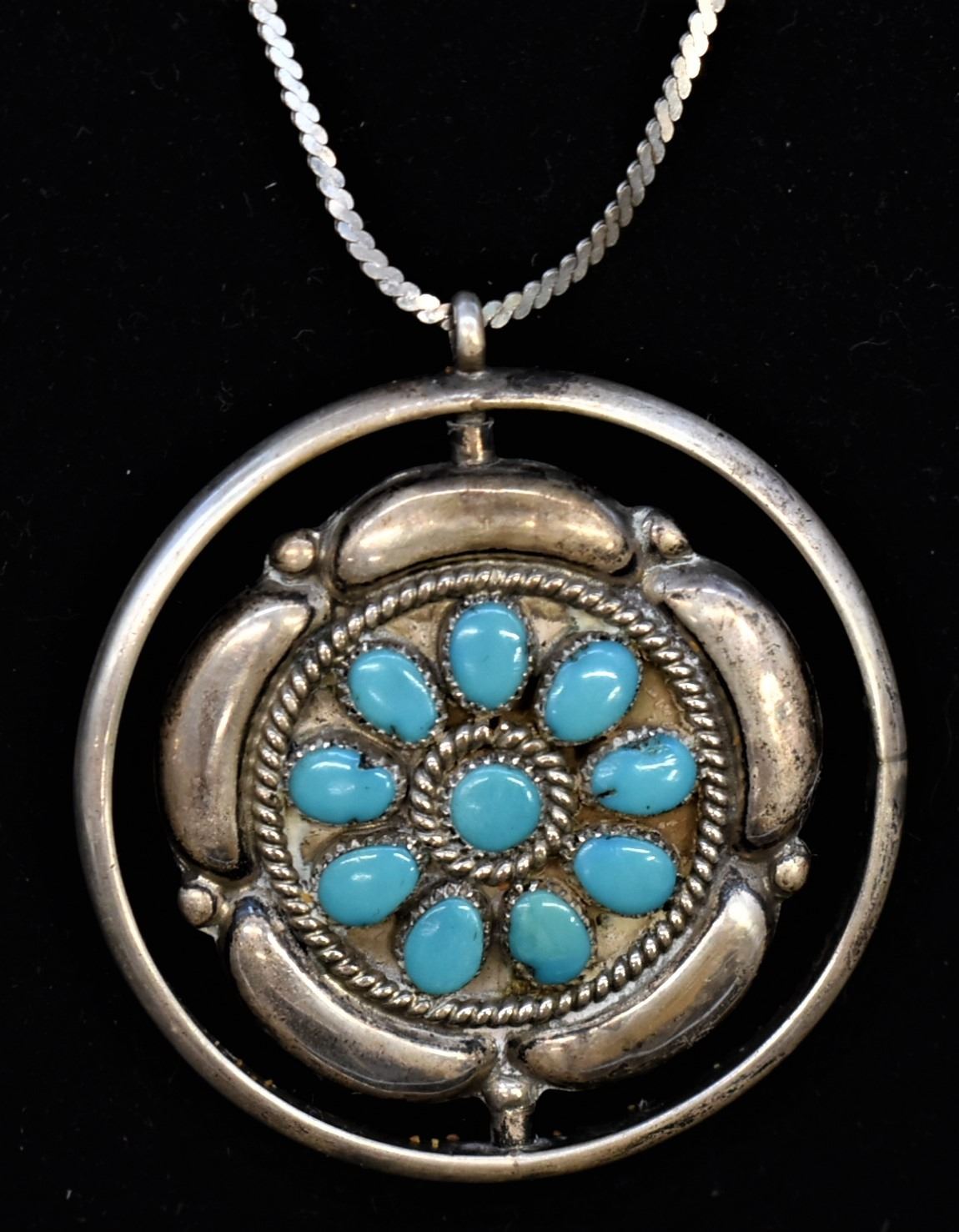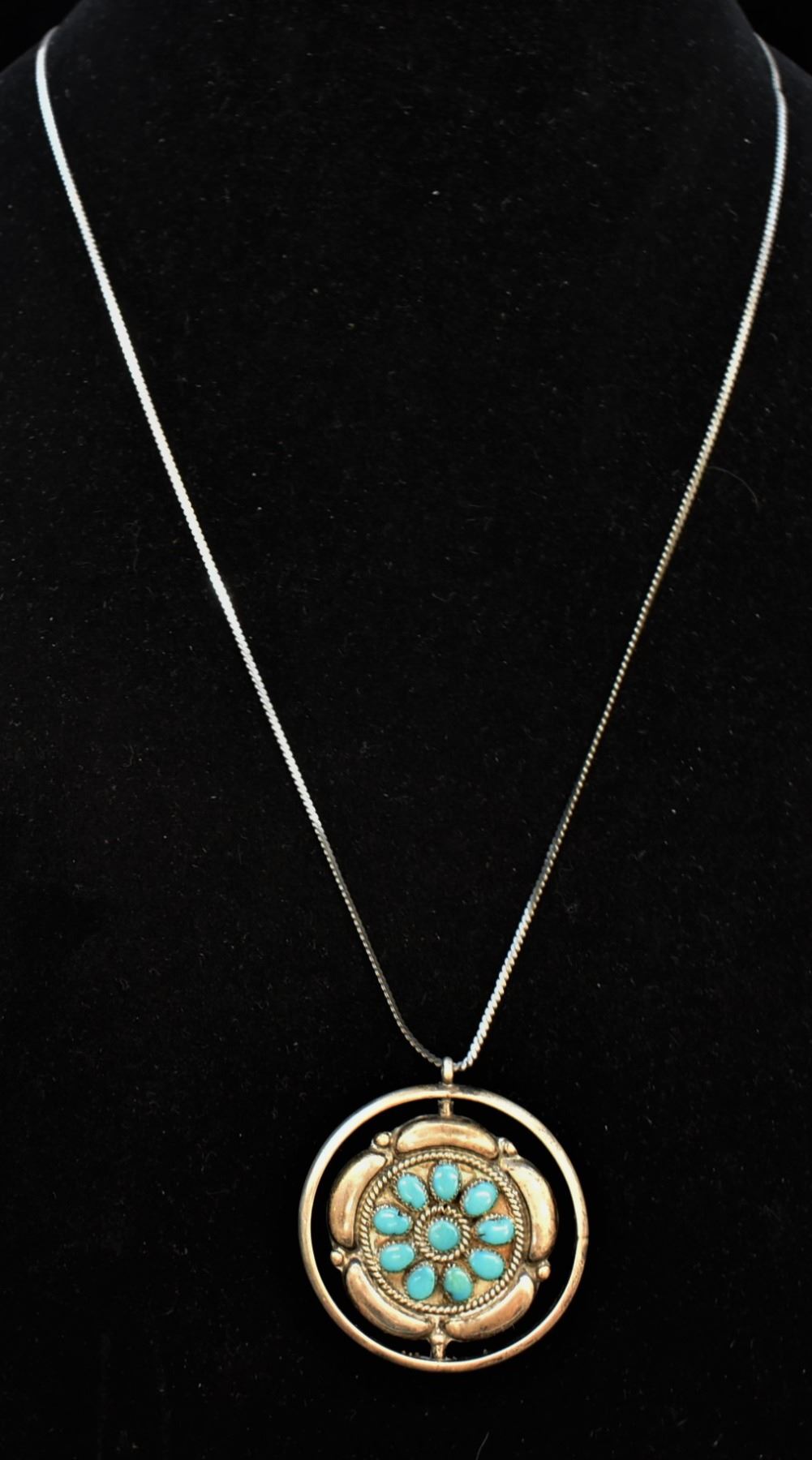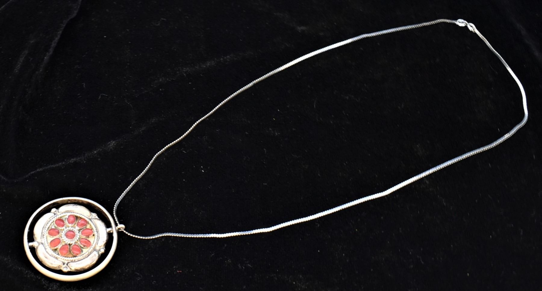 Estate Native American Zuni Sterling Turquoise & Coral Spinner Necklace by Fred and Elise Lonconsello, features 2 clusters one in turquoise and one in coral, hallmarked, sterling chain measures 23''L end to end and is stamped .925, pendant measures 2'' which includes the bale x 1.75'', total gram wt. of 30