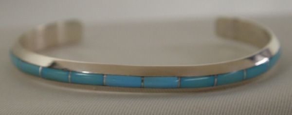 Native American Zuni Sterling Silver Channel Inlay Turquoise Bracelet Hallmarked, ''TL''. Gorgeous Delicate Inlay Guard Bracelet. Bracelet measures approx. 7'', inside measurement. Approx. 1/2'' in width.