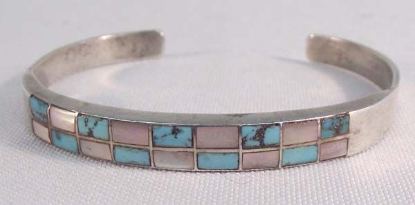 Native American Zuni Sterling Turquoise MOP Inlay Bracelet. Measures approx. 6 1/2'' x 1/4'' including opening.
