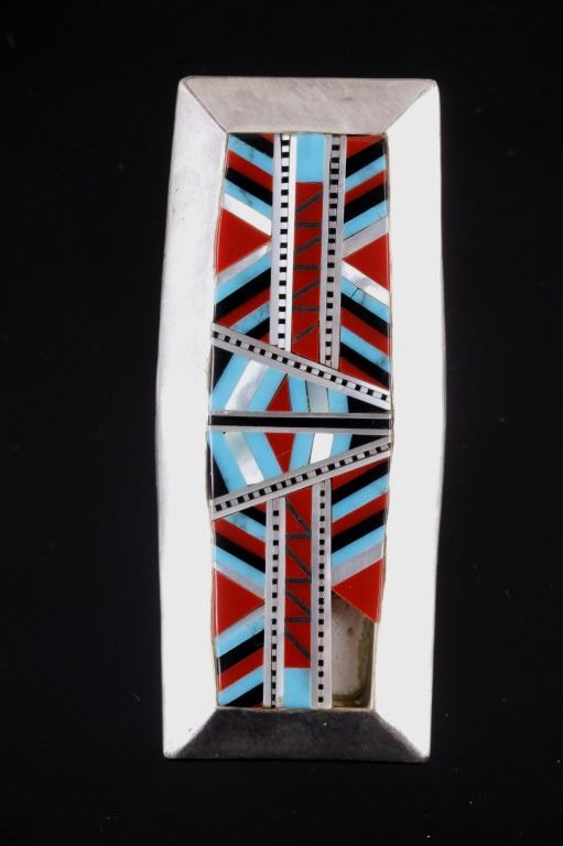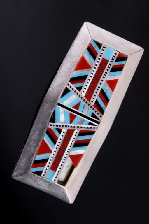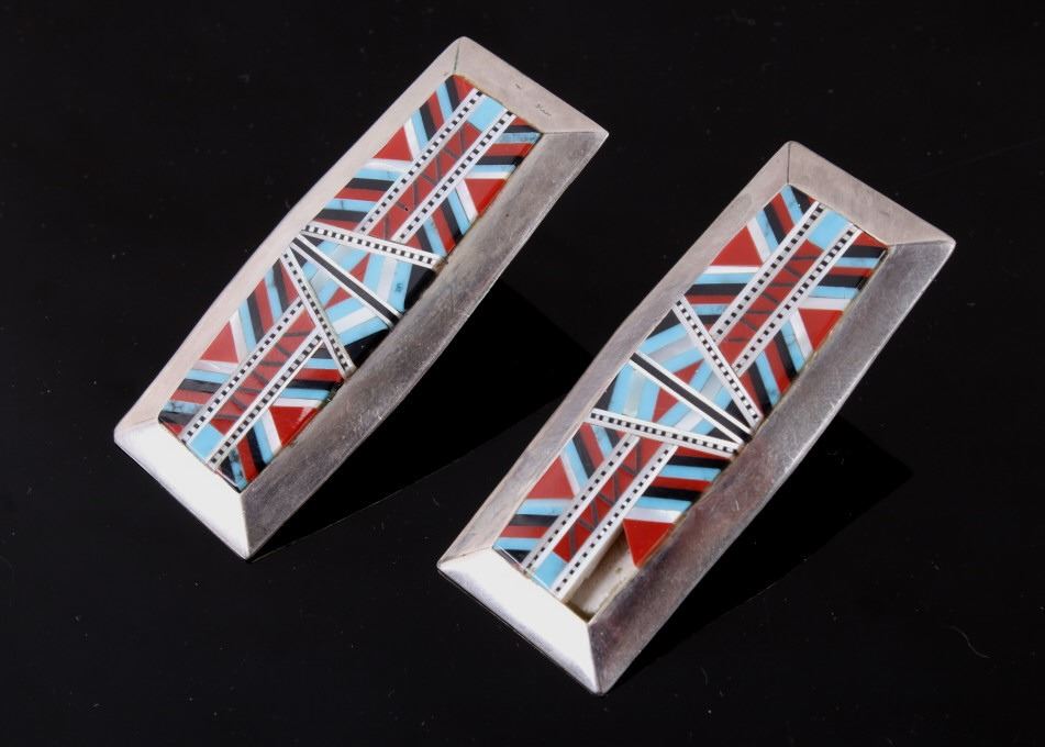 For your consideration is a wonderful pair of Zuni Native American sterling silver and multi stone inlay earrings. This pair of earrings are set on a stamped sterling base and feature a wonderful multi stone mosaic inlay. This stunningly detailed inlay is composed of branch coral, sleeping beauty turquoise, onyx and mother of pearl. The attention to detail and splendid mosaic pattern make these earrings truly unique. The back is stamped sterling and have a clip-on style attachment point. The earrings measure 2 3/8” x 1”.