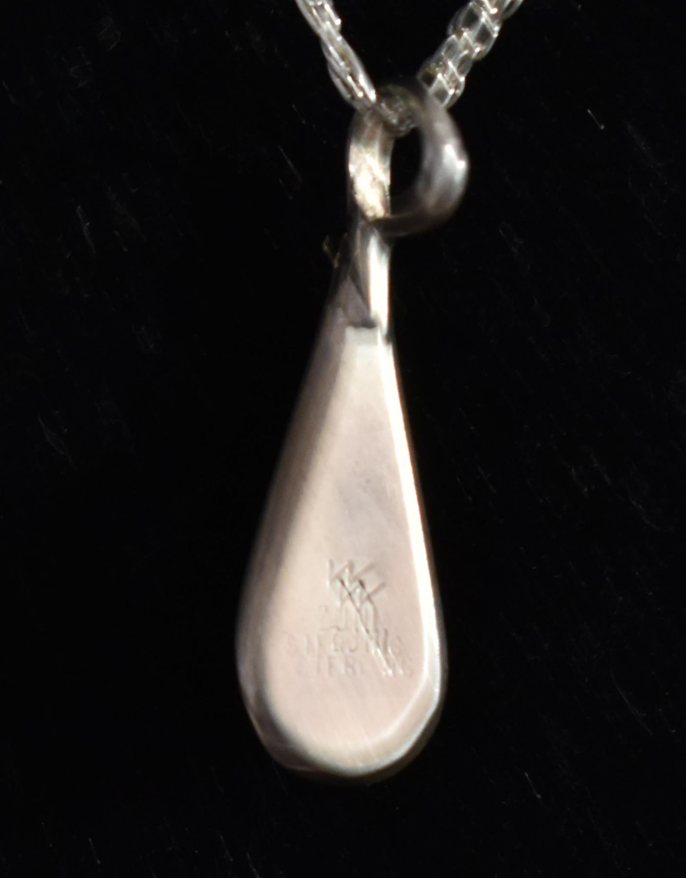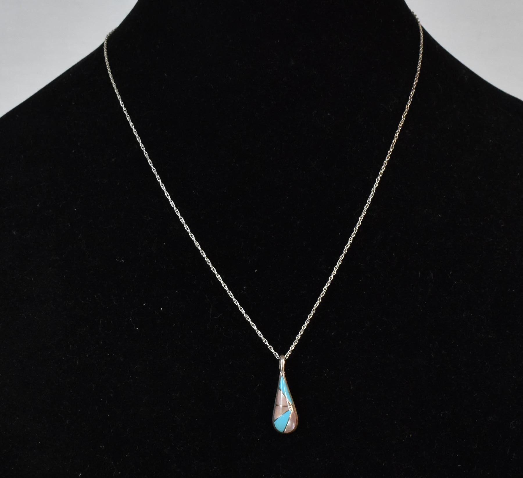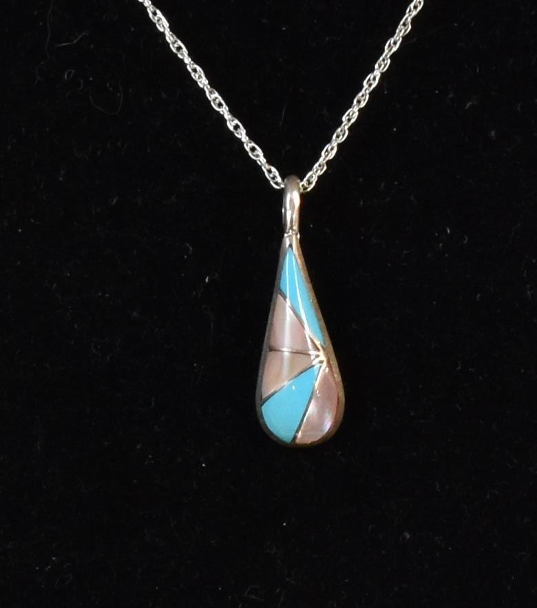 Native American Zuni Sterling Channel Inlay Turquoise Mother of Pearl Pendant Necklace by Kal Kallestewa, hallmarked KK and stamped sterling, pendant measures 1 1/8''L which includes the bale x 3/8''W, sterling chain measures 20''L end to end