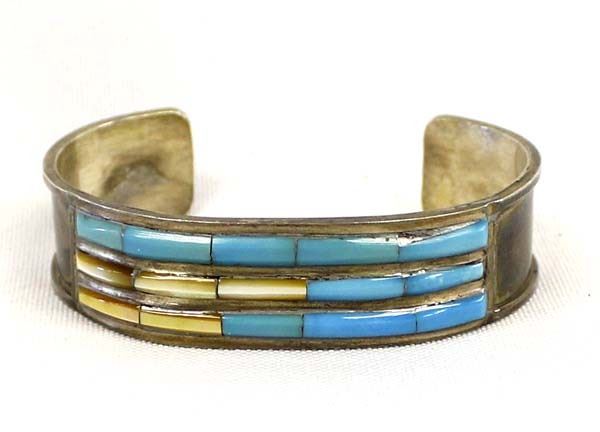 Native American Zuni Sterling Turquoise and Gold Lip Shell Overlay Cuff Bracelet, inside measures 6.5'' which includes the opening x .5''W, engraved initials S & S and Zuni, 25.43g in total wt.