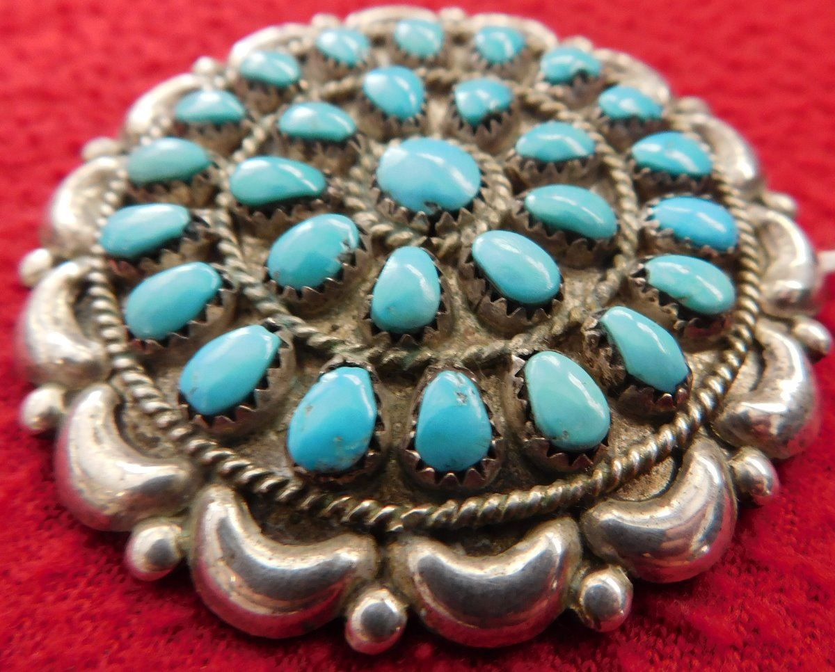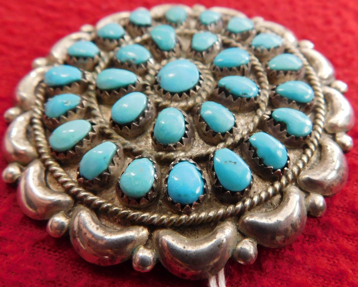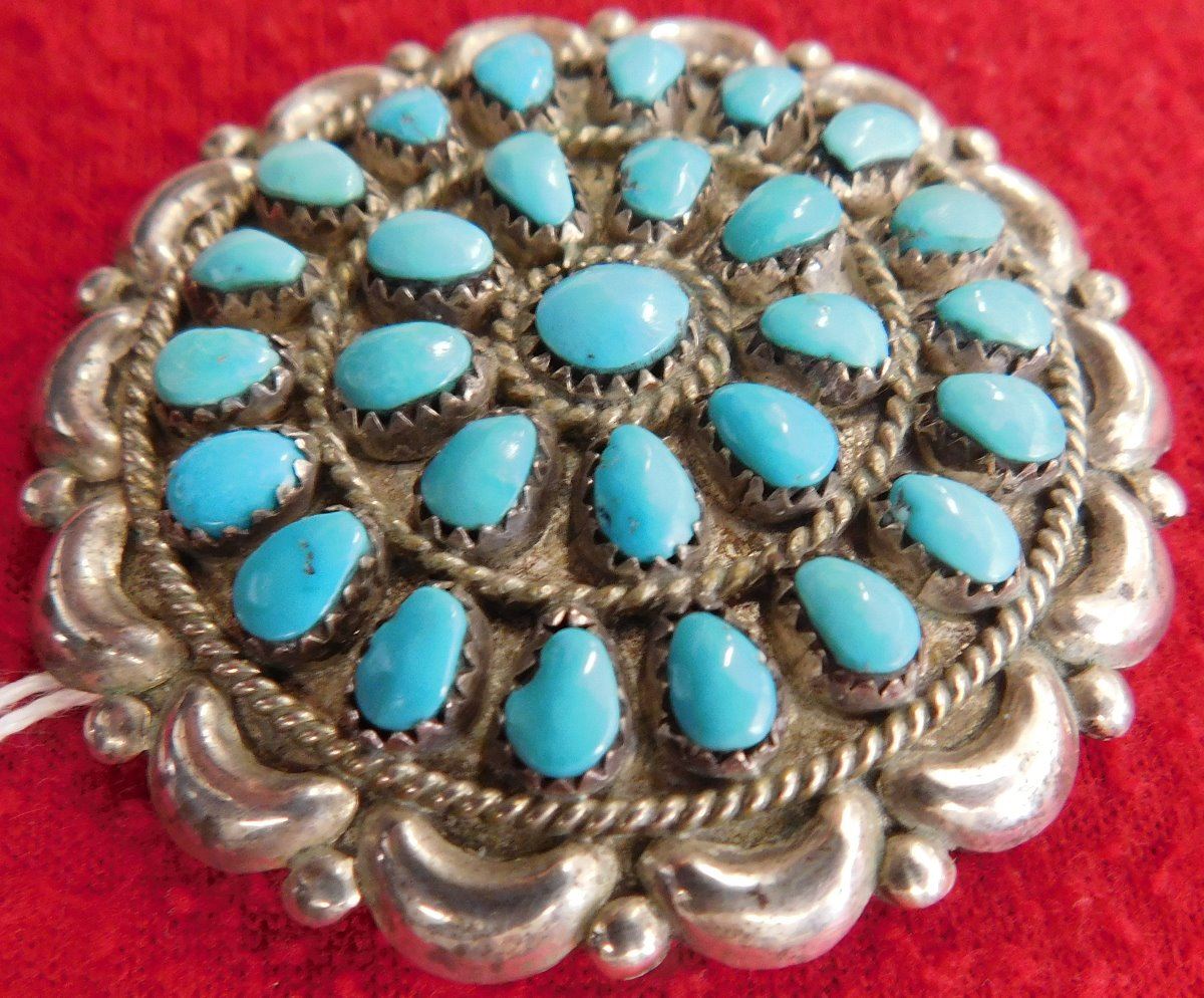 Zuni Sterling & Turquoise Pin or Pendant, circa 1950s. Made of sterling silver and turquoise, the item measures 2" x 2". Zuni, New Mexico. Signed HV, has 28 stones and weighs approx. 23.5 grams. Condition: Pre-owned, some patina, some corrosion, see images. Shipping: $12.50 w/insurance.
