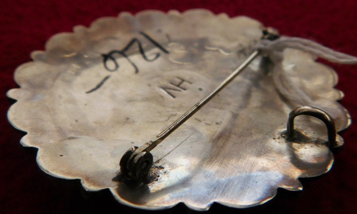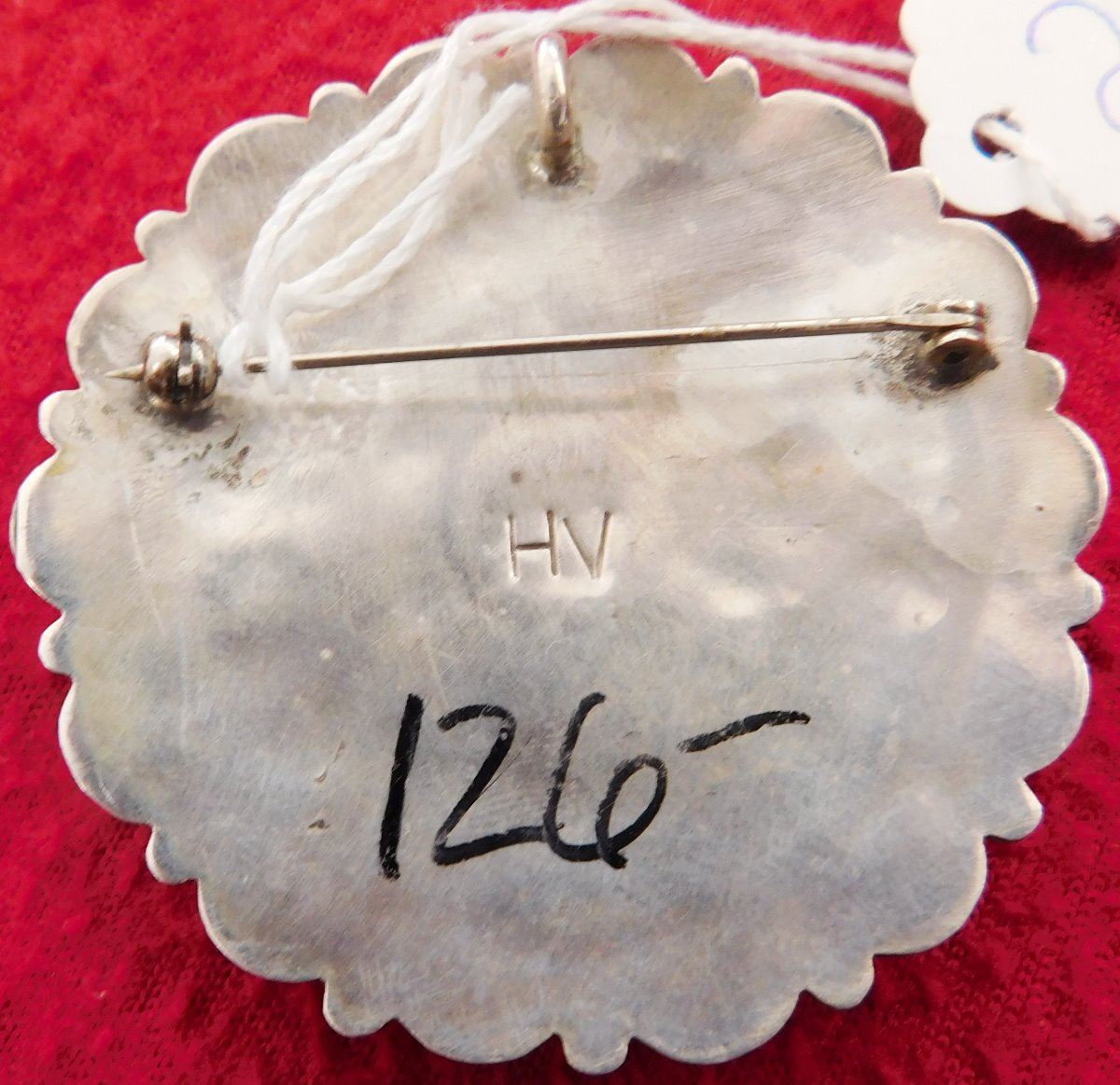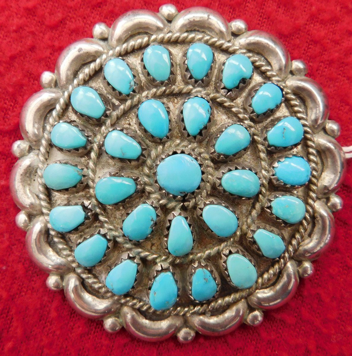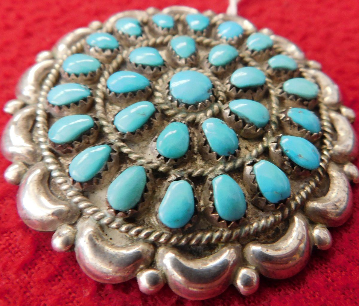 Zuni Sterling & Turquoise Pin or Pendant, circa 1950s. Made of sterling silver and turquoise, the item measures 2" x 2". Zuni, New Mexico. Signed HV, has 28 stones and weighs approx. 23.5 grams. Condition: Pre-owned, some patina, some corrosion, see images. Shipping: $12.50 w/insurance.